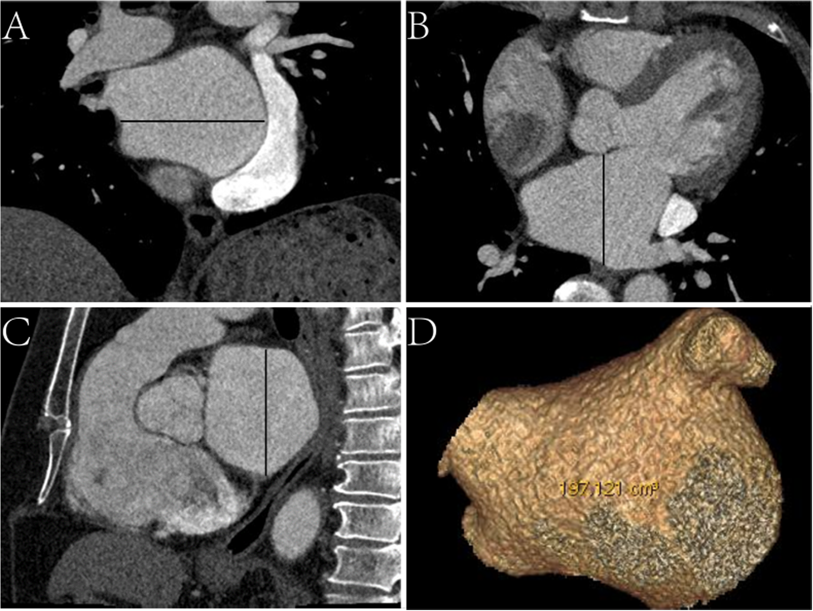 Schematic diagram of measurements of left atrial CT characteristics. (A) Coronal CT image, the black line represents the left–right diameter. (B) Axial CT image, the black line represents the anteroposterior diameter. (C) Sagittal CT image, the black line represents the upper-down diameter. (D) Virtual reality CT image displaying the volume.