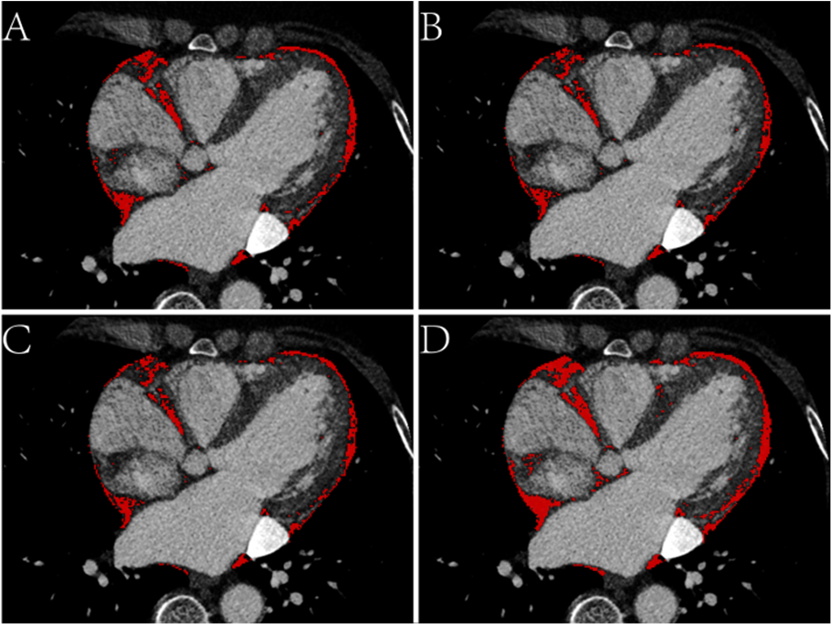 Axial CT images of the epicardial adipose tissue (EAT) based on four attenuation ranges. (A) The red area represents the EAT based on -190 to -30 HU. (B) The red area represents the EAT based on -195 to -45 HU. (C) The red area represents the EAT based on -200 to -45 HU. (D) The red area represents the EAT based on -200 to 0 HU.
