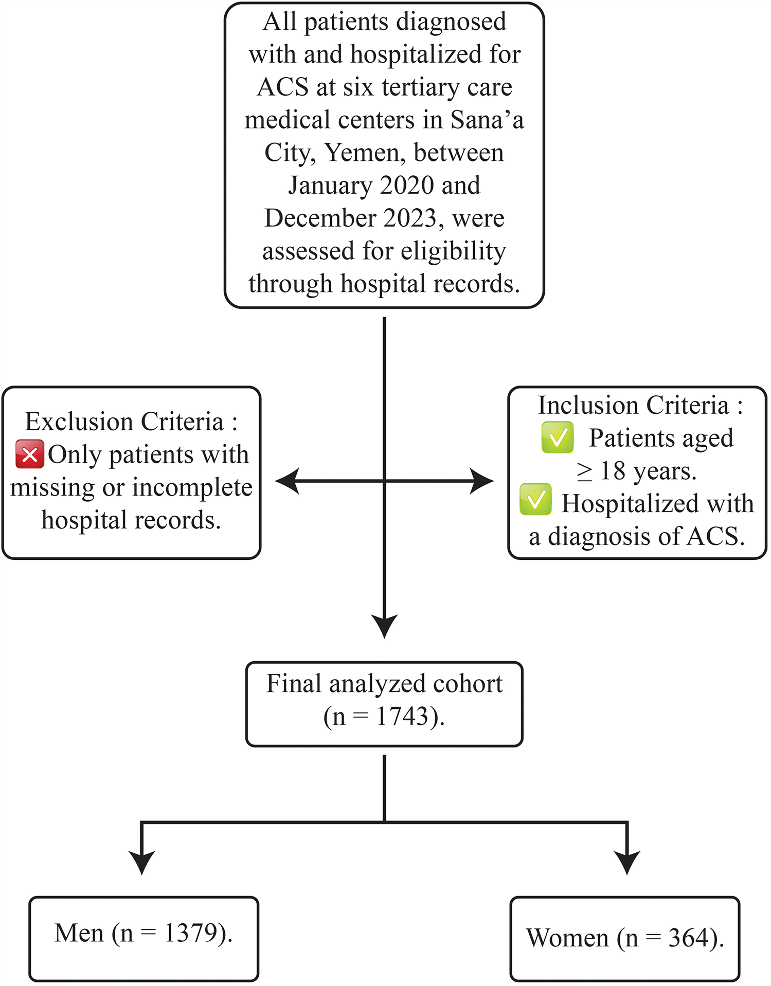 We retrospectively evaluated sex-related differences in presentation, management, and outcomes in patients hospitalized with ACS at six tertiary care medical centers in Sana'a City, Yemen (Al Thawra Modern General Hospital, Azal Hospital, Modern European Hospital, University of Science and Technology Hospital, Military Cardiac Center, and Hashim Iraqi Hospital), between January 2020 and December 2023. All patients with ACS aged 18 and older were included, with no exclusion criteria other than missing or incomplete hospital records.