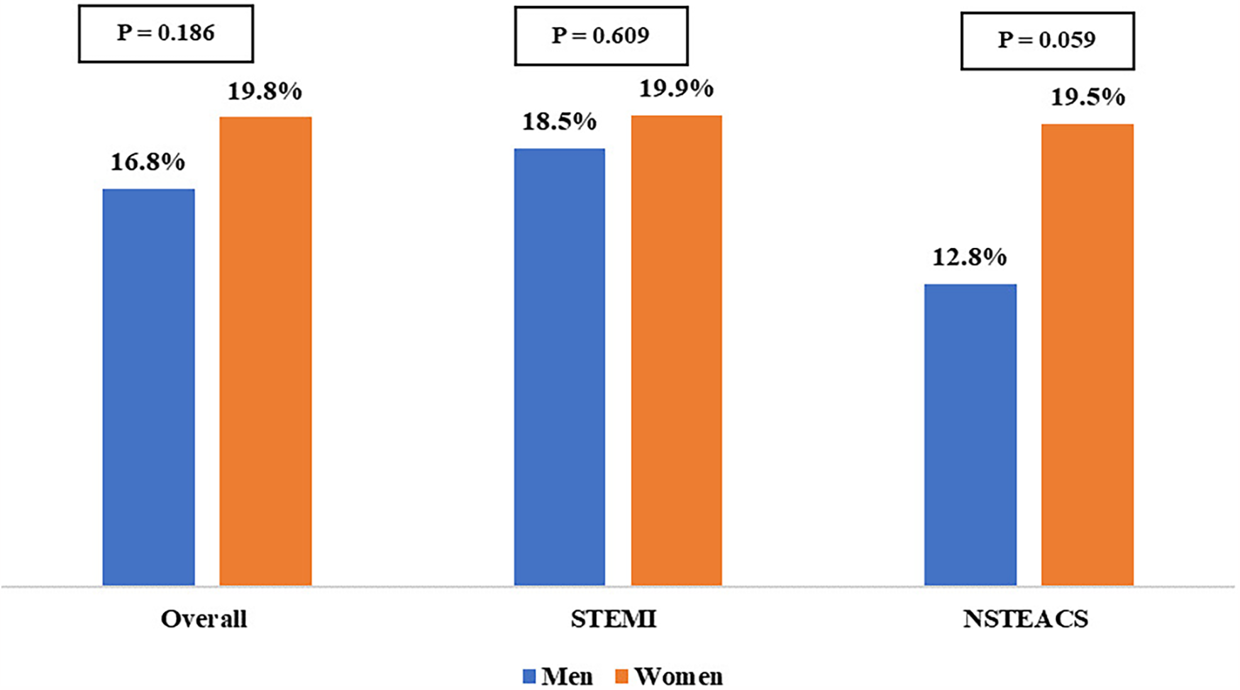 Table 3 presents a comparison of adverse in-hospital outcomes between men and women based on ACS type. Women exhibited higher rates of adverse outcomes compared to men, including CHF (24.5% vs. 18.3%, P = 0.009), recurrent ischemia (35.4% vs. 26.1%, P < 0.001), and mortality (12.6% vs. 7.6%, P = 0.002). These differences were particularly pronounced in patients with STEMI. In contrast, for patients with NSTEACS, only recurrent ischemia remained significantly higher in women than in men (32.8% vs. 22.8%, P = 0.023).
