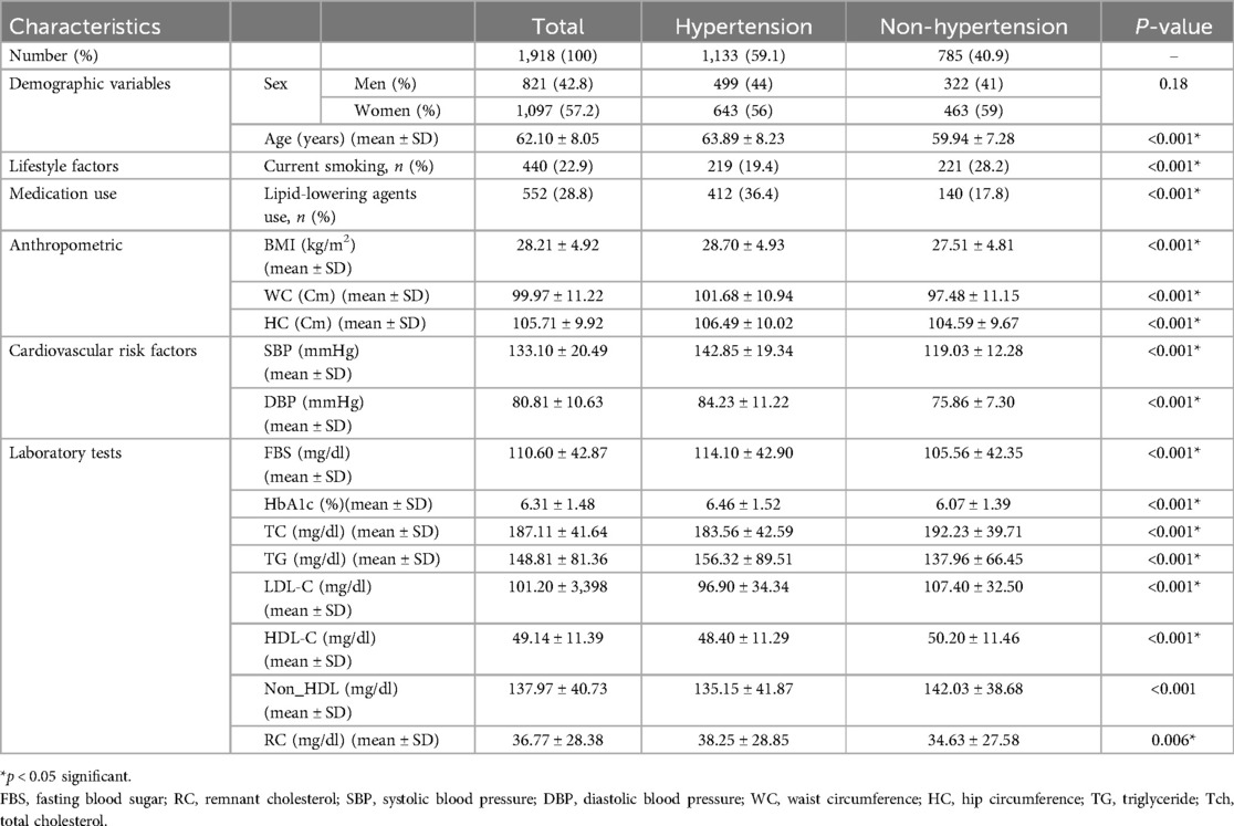 Generally, 1,918 people with a mean age of 62.10 ± 8.05 years were included in the study, of whom 1,133 (59.1%) were hypertensive, and 57.2% were females (1,097). The baseline characteristics of the participants are presented in Table 1. Individuals in the HTN group had higher values for age, BMI, FBS, WC, HC, and HbA1c (%), and a lower percentage of current smokers. The non-hypertension group exhibited higher levels of TC, HDL-c, LDL-C, and non-HDL-c (p < 0.001), whereas hypertensive individuals showed higher levels of RC and TG (p < 0.01). Moreover, the usage of lipid-lowering agents was higher in hypertensive individuals compared to non-hypertensive individuals (p < 0.001) (Table 1).