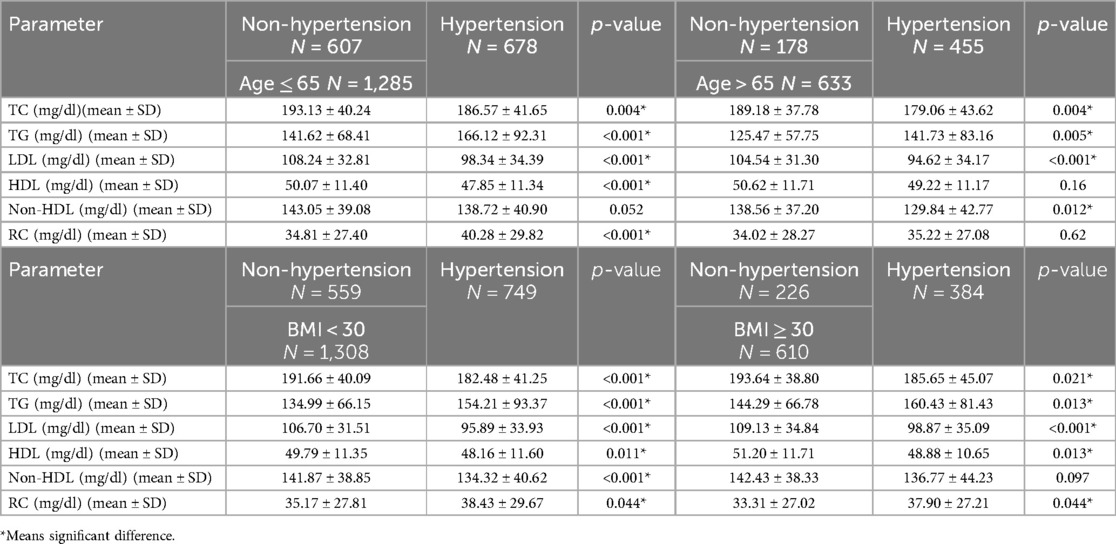 Differences in lipid profiles between hypertensive and non-hypertensive groups based on age and BMI