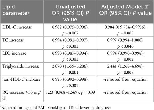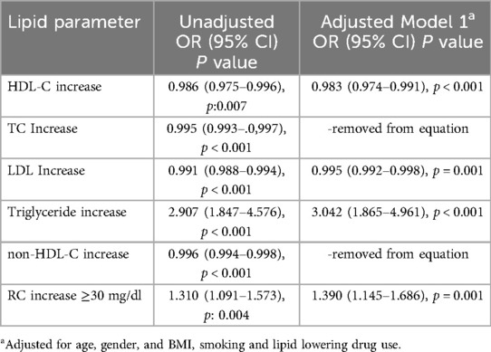 Based on the crude model in the entire population, an increase in RC ≥ 30 and TG levels was associated with increased risk of HTN [1.390 (1.145–1.686)], p = 0.001) and [3.042 (1.865–4.961), p < 0.001], respectively. This positive association was observed after adjustment for age, gender, BMI, smoking and lipid-lowering drug use. Both unadjusted and adjusted models showed that an increase in HDL-c exhibited a negative trend with the risk of HTN and reduced the risk of HTN, as shown in Table 3. Relation of other lipid factors including TC, LDL-C and non-HDL-C with HTN are shown in Table 3, also.