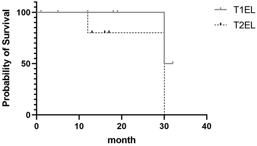 Kaplan–Meier survival curves showing the overall survival of patients with T1EL and T2EL. Their median survival rate was 31 and 30 months, respectively.