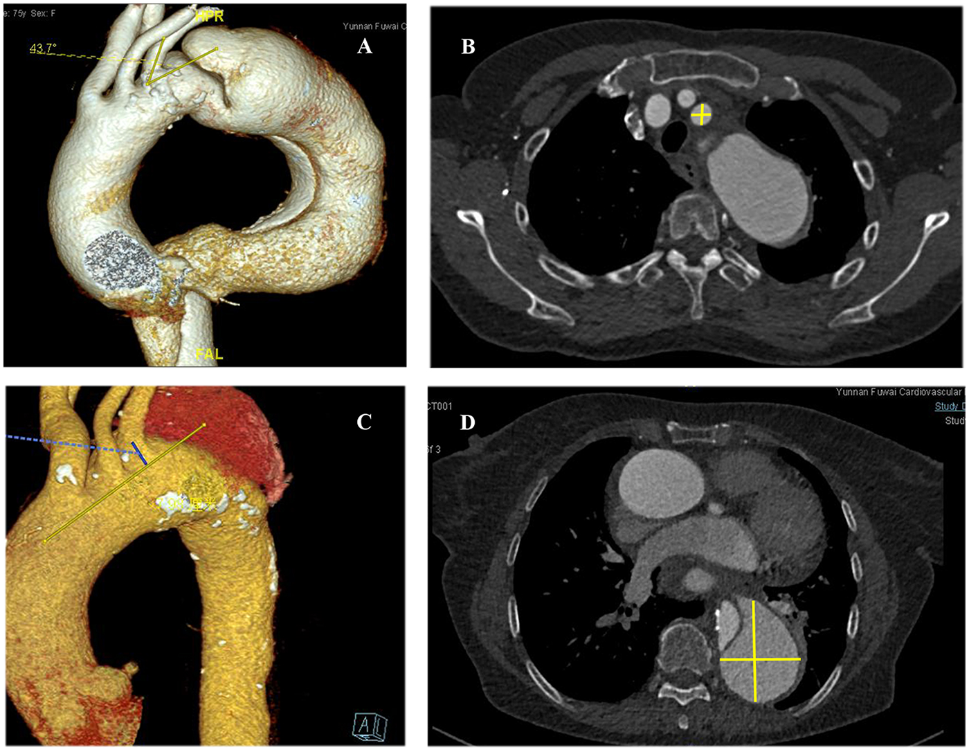 From November 2018 to March 2022, we reviewed 245 patients who underwent TEVAR/open surgery (type II hybrid arch repair) at our department. This was a single-center study. Data from 14 patients with type I or II endoleaks were retrospectively collected and analyzed. Among them, 11 patients were referred to our center between 1 week and 5 years after undergoing TEVAR at another hospital, whereas 3 patients were evaluated 1 week after undergoing TEVAR at our center. The study was conducted in accordance with the Declaration of Helsinki, and the protocol was approved by the Institutional Ethics Review Board of Fuwai Yunnan Cardiovascular Disease Hospital (approval number: 2022-071-01) without the need for patient informed consent. All patients were enrolled in a follow-up program that included periodic visits by a dedicated team at 1, 6, and 12 months after surgery, followed by annual assessments. Computed tomography angiography (CTA) was used to confirm the diagnosis of aortic disease [e.g., TAD, thoracic aortic aneurysm (TAA), and/or type B intramural hematoma (IMH)] and the presence of T1ELs or T2ELs. In this study, a T2EL was defined as persistent retrograde FL perfusion from the intercostal artery or the LSA. Patients undergoing open surgery/TEVAR for type A intramural hematoma, traumatic aortic transection, syphilitic aortic aneurysm, and tuberculosis aortic pseudoaneurysm were excluded from this retrospective study (7, 8). Another inclusion criterion comprised the availability of preoperative and postoperative CTA images with slice thicknesses of 6–8 mm. Vascular pathologies included TAD in 154 patients, TAA in 35 patients, and type B IMH in 56 patients (Table 1). The follow-up period was 18 ± 10 months. All patients were diagnosed and categorized into two groups on the basis of CTA. There were seven patients (2.8%) in the T1EL group and seven patients (2.8%) in the T2EL group. The mean age of the T1EL group was 65 ± 14 years; all patients were men; in this group, four patients agreed to reoperation and repair, and one patient died. The mean age of the T2EL group was 64 ± 10 years; 71% were men, while 29% were women; in this group, two patients agreed to reoperation and repair, and one patient died.