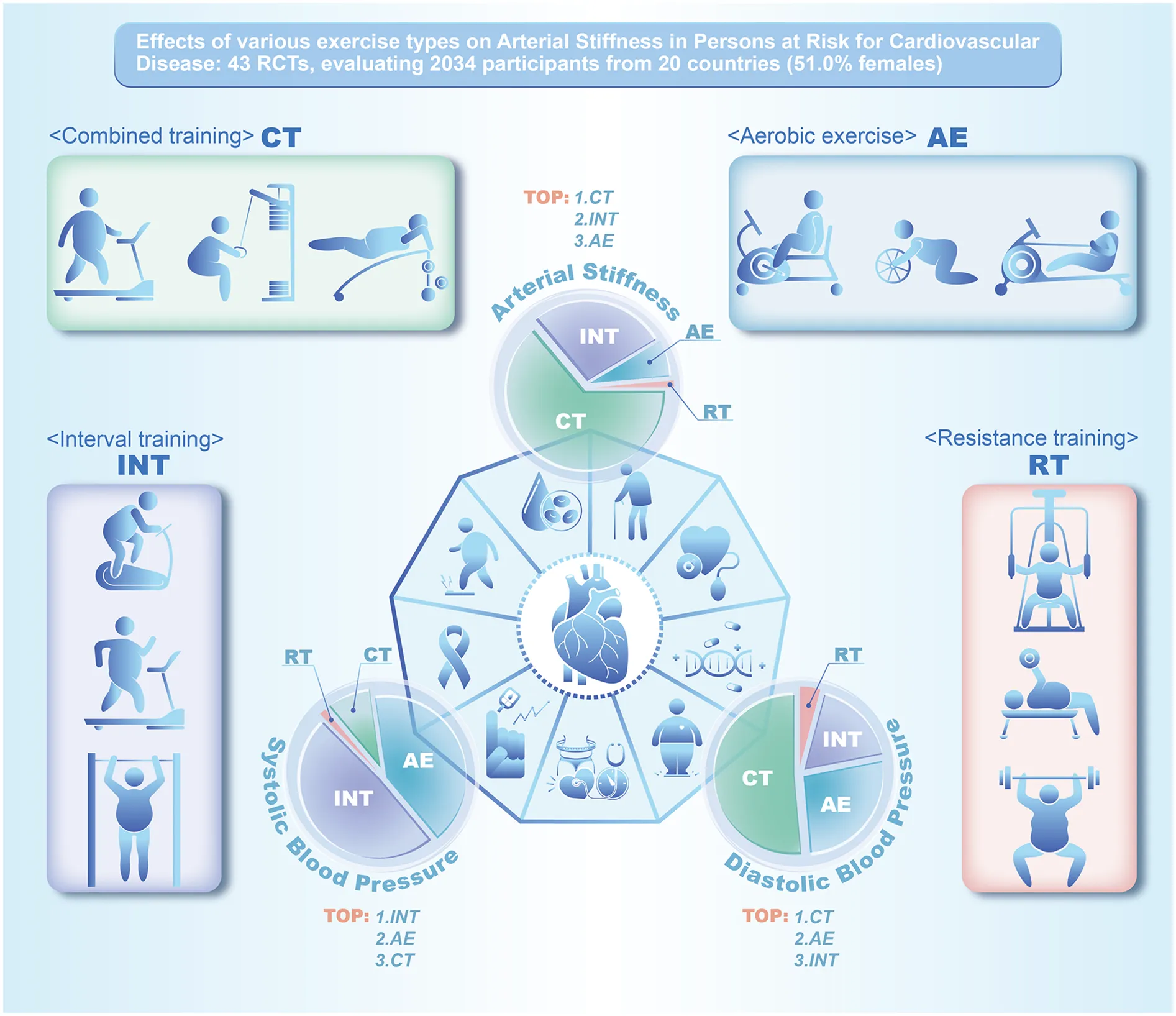 Aerobic exercise (AE) is often recommended for improving vascular function due to its effects on vasodilators like calcium (Ca2+), potassium (K+), hydrogen ions (H+), and carbon dioxide (CO2) (3). Interval training (INT) may offer even greater benefits for AS and blood pressure than AE (4). Resistance training (RT) presents mixed results; high-intensity RT might increase blood pressure while reducing AS (5), but it could also induce arteriosclerosis in younger individuals without affecting older adults (3, 6). Combined training (CT), which includes both AE and RT, is considered highly effective for improving AS (7), with the order of exercises affecting results—CT with AE following RT shows better outcomes than the reverse (8).