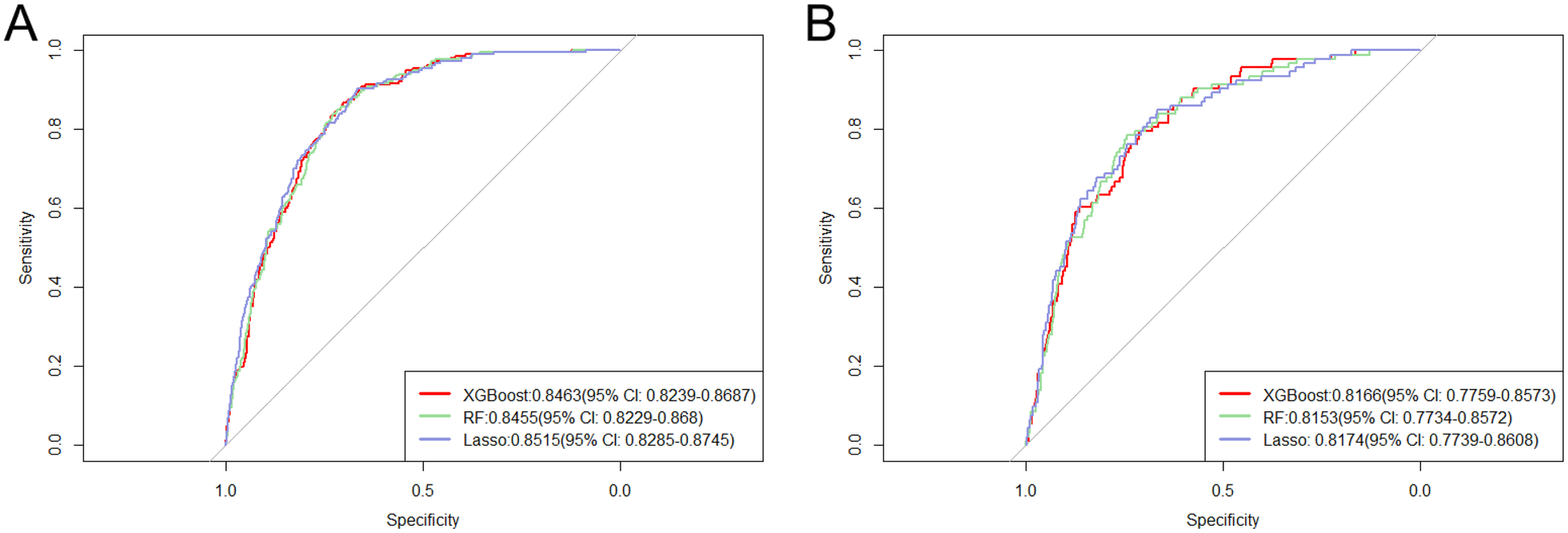 Logistic regression models were constructed using features selected by XGBoost, Random Forest and LASSO regression, respectively. The data from the training and test sets were incorporated into the three models to generate their respective ROC curves (Figure 1). The AUCs of the three models in the training set are 0.846, 0.846 and 0.852, respectively. The AUCs of the three models in the test set are 0.817, 0.815 and 0.817, respectively. The AUCs of the “LASSO model” in the training and test sets are higher than those of the other models, although the differences are relatively minor.
