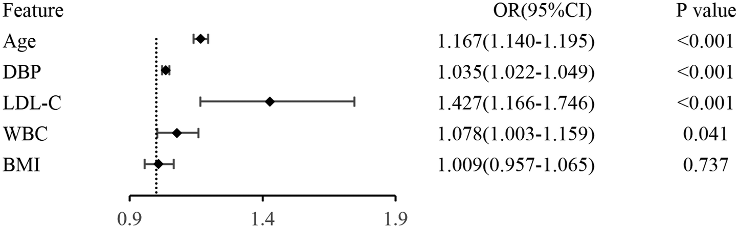 A forest plot was constructed based on the characteristics of the “XGBoost model” (Figure 2). It was found that age, diastolic blood pressure (DBP), low-density lipoprotein cholesterol (LDL-C), and white blood cell count (WBC) were the risk factors for carotid artery plaques among coal miners, with odds ratios (ORs) greater than 1 and statistically significant differences.