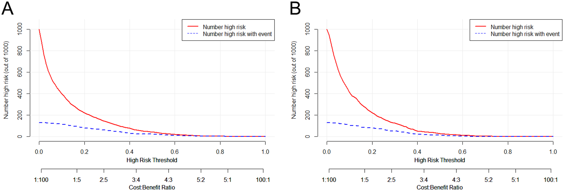 In the XGBoost algorithm, the hyperparameters of the model are selected through cross-validation and random search. The optimal number of iterations of the model is obtained by monitoring the number of iterations of the model using the test data, thereby preventing overfitting (Supplementary Figure S2). The optimal number of iterations and the optimal hyperparameters of the model were then incorporated into the model. The relative importance of the features was determined by training the model on the training set. Features with the highest feature importance were extracted and plotted on a bar graph (Supplementary Figure S3). The five most important features were selected for the next step of model construction, and the resulting prediction model was named the “XGBoost model”.