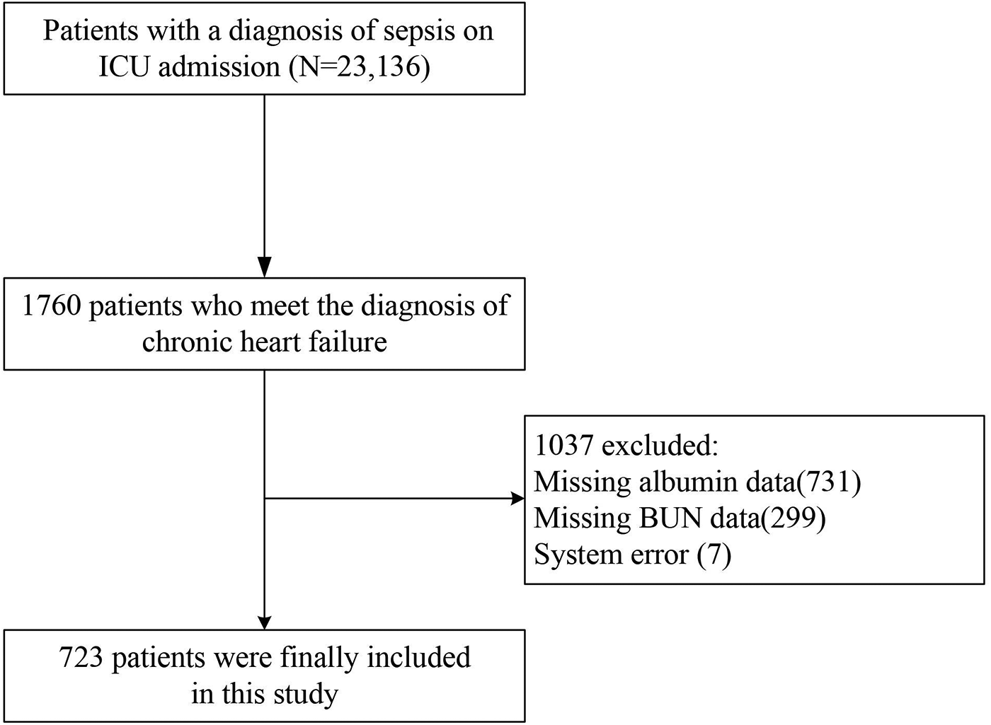 In the study population, patients admitted to the intensive care unit (ICU) with a diagnosis of sepsis and chronic heart failure, sepsis was defined according to Sepsis-3.0 criteria (2016) as an increase of ≥2 points in the Sequential Organ Failure Assessment (SOFA) score plus confirmed or suspected infection (19), and the diagnosis of chronic heart failure was based on the patient's clinical presentation, echocardiography showing structural and functional abnormalities of the heart (e.g., decreased ejection fraction), and blood testing for BNP or NT-proBNP (20, 21). Sepsis and chronic heart failure were identified according to the ICD-9 code in the eICU Cooperative Research Database. The selection process of the study population was as follows: 23,136 individuals met the diagnostic criteria for sepsis. Out of these, 1,760 individuals met the diagnostic criteria for chronic heart failure. Additionally, 731 individuals were missing albumin data, leaving 1,029 individuals. Furthermore, 299 individuals were missing BUN data, resulting in 723 individuals who were finally included in the study, as shown in Figure 1.