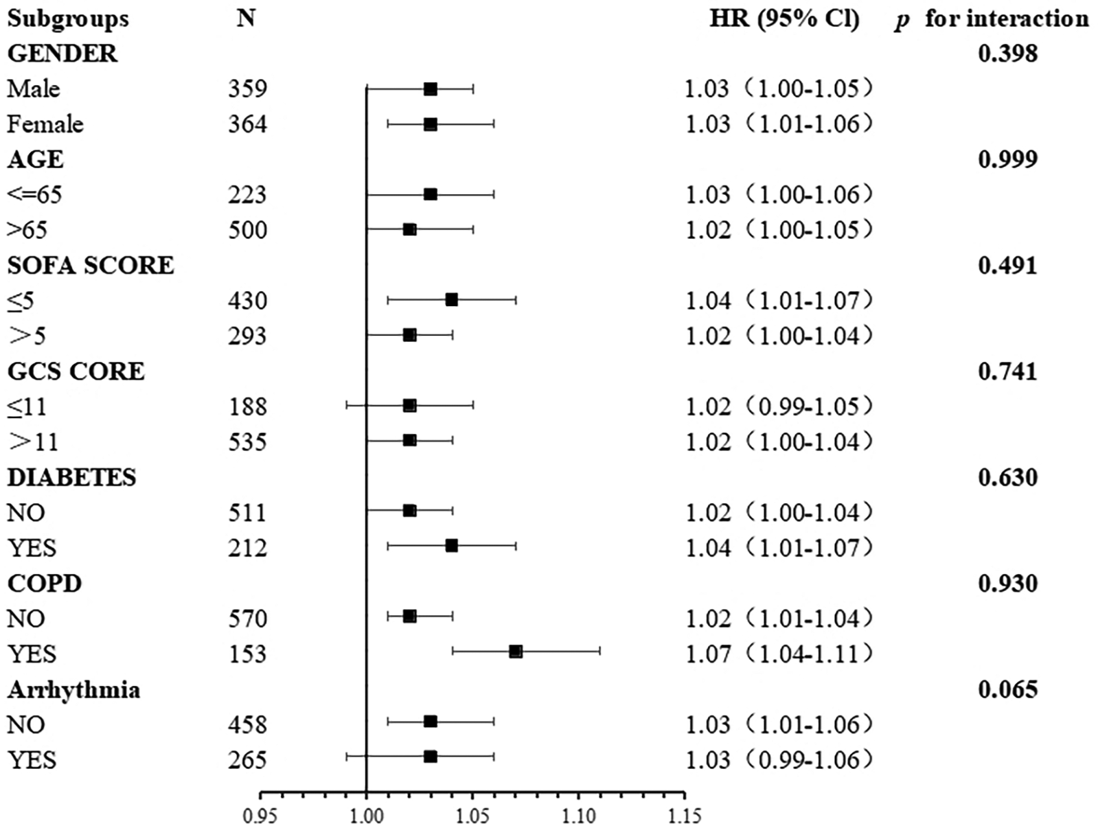 Data were presented as HR (95% CI) p value; Model I, linear analysis; Model II, non-linear analysis. Adjusted for Gender, Age (years), BMI(Kg/m2), COPD, Diabetes, Arrhythmia, MAP Mean arterial pressure (mmHg), Heart rate (/min), Temperature, AST aspartate transaminase (U/L), total protein (g/dl), SOFA score, GCS score. LRT logarithm likelihood ratio test.