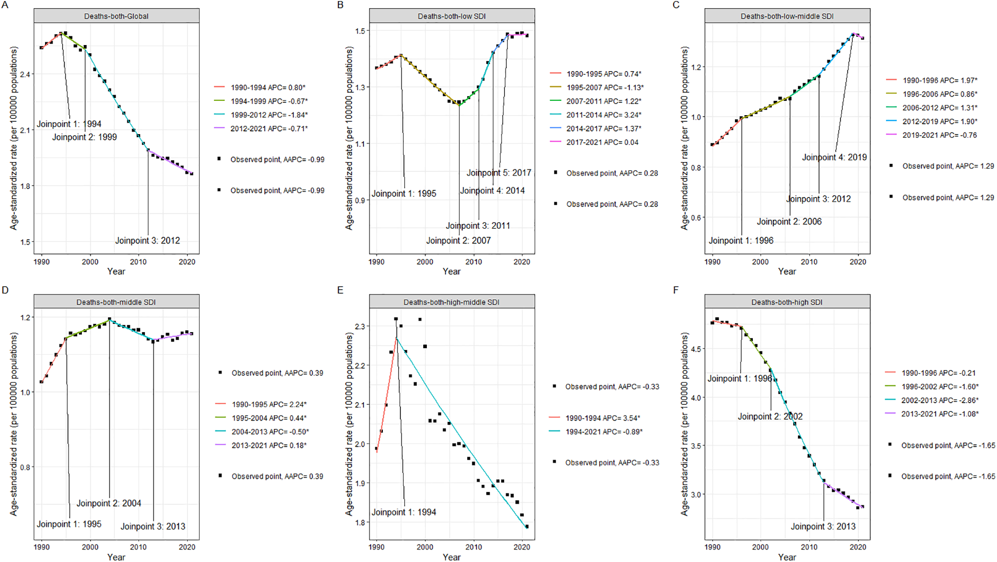 Joinpoint plot of ASDR and its mean annual change in AA by region of the global and different SDI from 1990 to 2021. (A) Global. (B) Low SDI. (C) Low-middle SDI. (D) Middle SDI. (E) High-middle SDI. (F) High SDI.