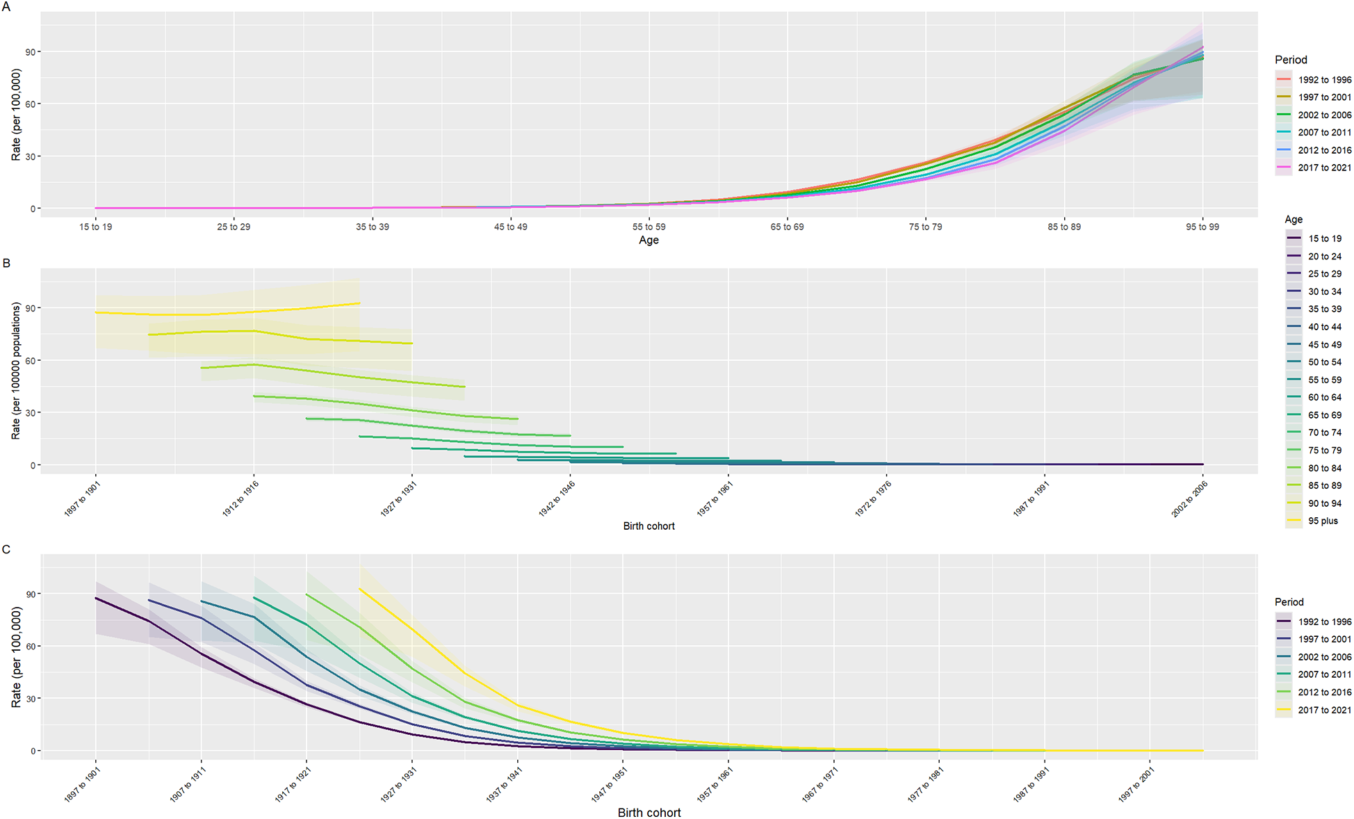 Age-period-cohort model. (A) Age is divided by a 5-year-old period, and the curve represents the change in mortality with the change of age period; (B) The relationship between birth cohorts and death rates, where different colors represent different age groups; (C) The relationship between birth cohort and mortality rate, where different colors represent different period.