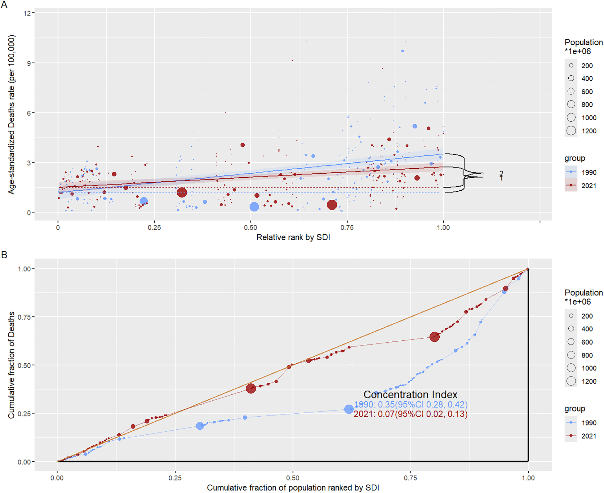 Analysis of mortality inequality in different SDI regions. (A) Relationship between relative rank and ASDR for SDI regions in 1990 and 2021; (B) The relationship between the cumulative score of the overall ranking by SDI and the cumulative score of death in 1990 and 2021, where Concentration Index stands for a relative measure of health inequality and reflects the distribution of health indicators in socioeconomic status. A value close to 0 indicates that the inequality is smaller, a positive value indicates that the given group is in good health, and a negative value indicates that the poor group is in good health.