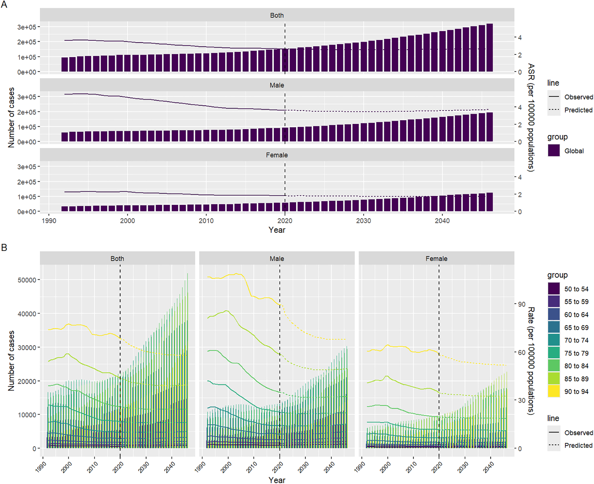 Based on the existing data, we predict the number of deaths and mortality caused by AA in the world by 2046. As can be seen from Figure A in Figure 9, the bar graph represents the number of deaths, the solid line represents the observed mortality change, and the dotted line curve represents the predicted mortality change (Supplementary Table S3). As can be seen from Figure 9, the number of deaths caused by AA increases with the increase of years, but the predicted mortality rate is decreasing year by year. By gender segmentation, AA has a greater health burden on global men than on women (Supplementary Table S4). Combined with Figure 5, it can be seen that the coefficient of APC exceeds 0 when the age is 55–59, indicating that once the age exceeds 55, the global disease burden caused by AA will increase exponentially, which can prove that AA over 55 years old is a risk factor for ASDR. Therefore, we predicted the ASDR caused by AA in men and women aged 50–94 years old. We can see the development law of ASDR. The older the age, the higher the ASDR. The number of deaths caused by AA increases year by year, but the ASDR decreases year by year, which is roughly consistent with the development law of Figure A. This may be related to the changes in global population growth, but the improvement of medical level shows that the global health burden of AA has decreased.