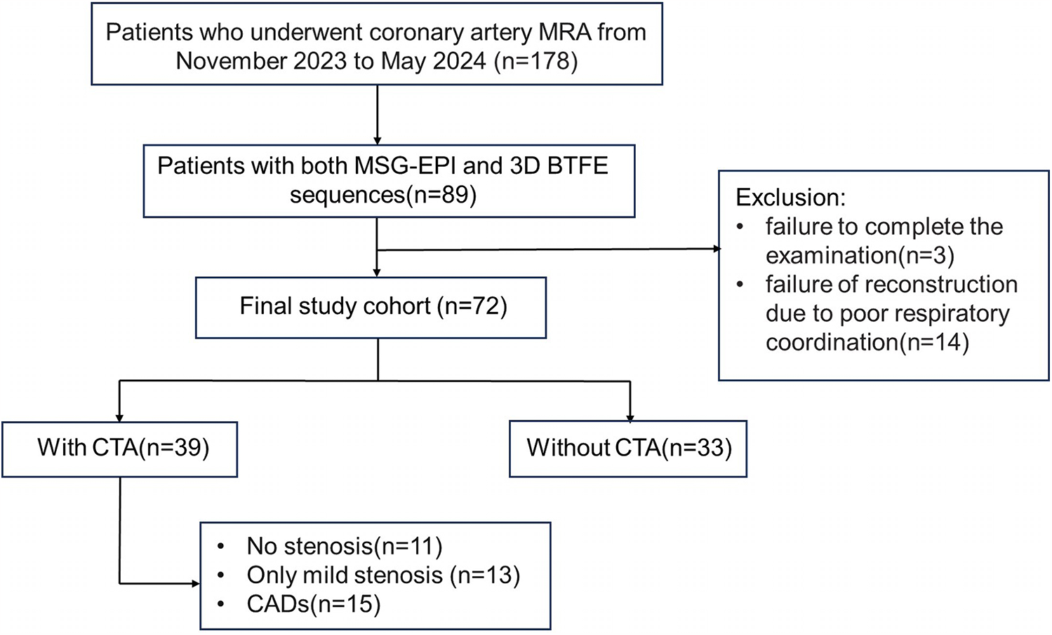 Methods: Patients undergoing CMRA in the Geriatric Hospital of Nanjing Medical University from November 2023 to May 2024 were included. We compared MSG-EPI and three-dimensional balanced turbo field echo (3D BTFE) sequence in acquisition time, subjective image score, signal-to-noise ratio (SNR) and contrast-to-noise ratio (CNR). With CTA as the reference standard, the linear weighted kappa and compared chi-square Mcnemar test were used to evaluate the diagnostic efficacy of both sequences for coronary artery diseases (CADs). The scale for the kappa coefficients was interpreted as follows: <0.2 = poor, 0.2–0.4 = fair, 0.4–0.6 = moderate, 0.6–0.8 = substantial, and >0.8 = excellent.