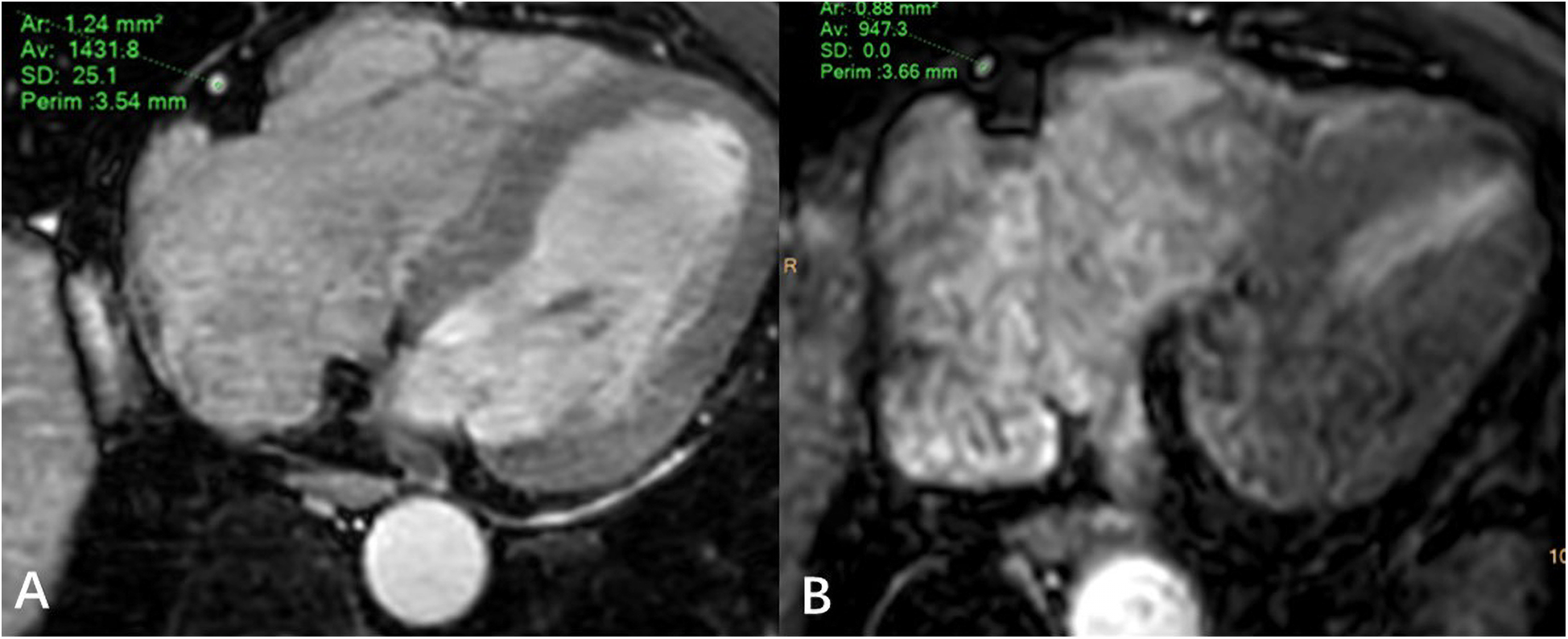 JZ and WL draw regions of interest in the axial MSG-EPI and 3D BTFE sequences. The regions of interest were slightly smaller than the lumen size, and vessels, artifacts, and stenosis areas should be avoided as much as possible (Figure 3). Signal intensity (SI) and standard deviation (SD) of coronary artery segments and myocardium were measured. The signal-to-noise ratio (SNR) and contrast-to-noise ratio (CNR) of each segment of the coronary artery were calculated as follows: SNR = SIcoronary artery/SDmyocardium; CNR = (SIcoronary artery − SImyocardium)/SDmyocardium. In order to minimize the deviation of a single measurement, measurements were made three times and the average value was calculated.