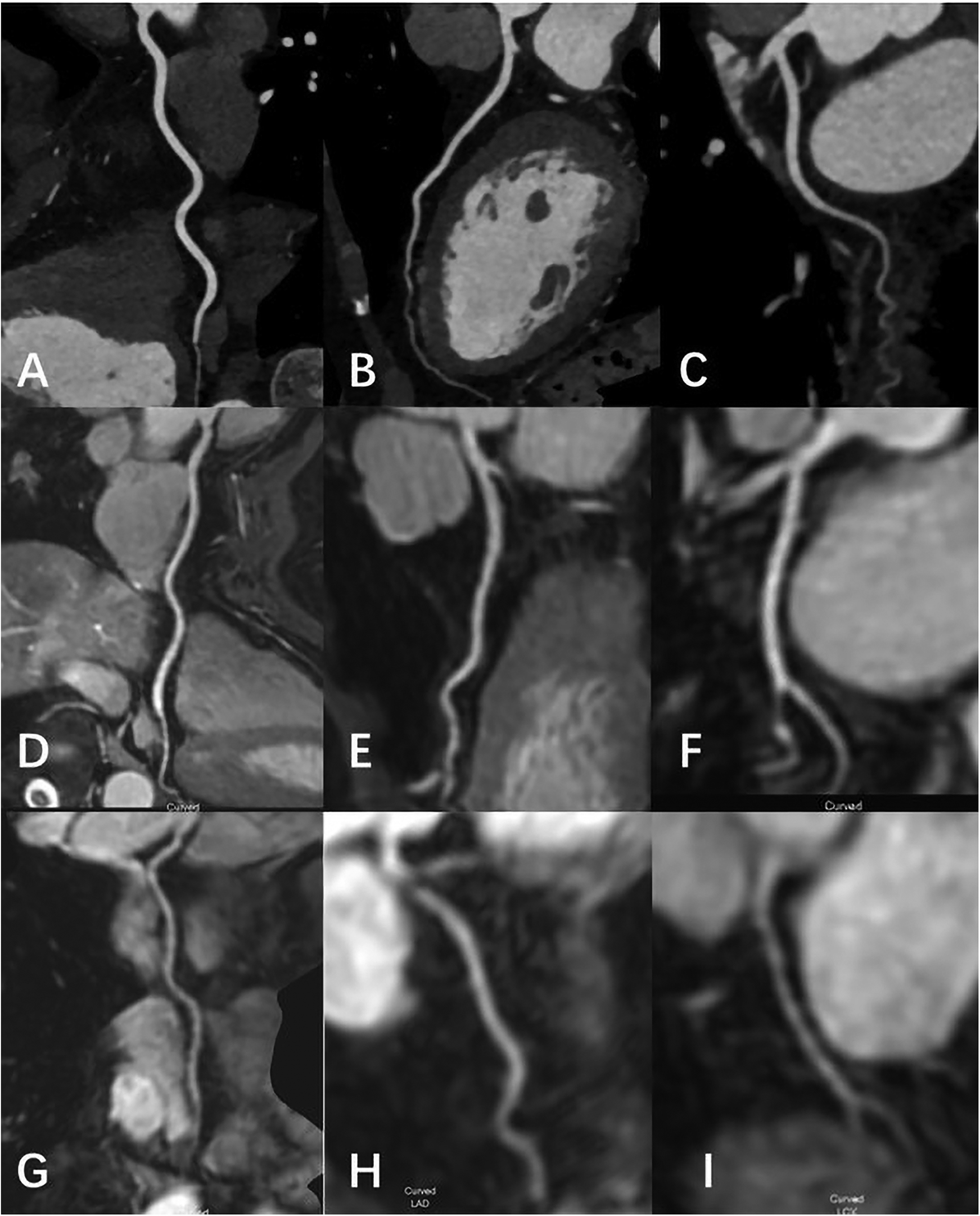 Figure 4. Female, 69 Y, with chest pain. (A–C) The RCA, LAD, LCX shown in coronary CTA, coronary artery stenosis was not observed; (D-F) the RCA, LAD, LCX shown in 3D-BTFE sequence, the lumen edges were sharp, the coronary arteries were clearly delineated, and the subjective images scored 5; (G–I) the RCA, LAD, LCX shown in MSG-EPI sequence, and the subjective images scored 4.