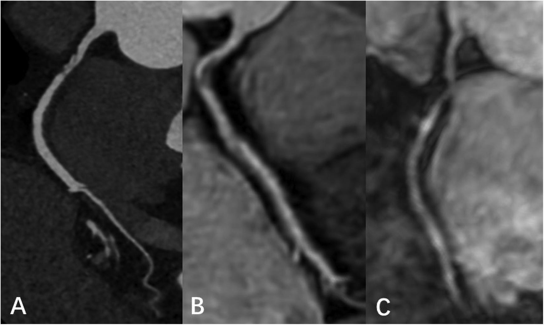 Coronary artery diseases (CADs) have a high incidence, early screening and accurate diagnosis of CADs are crucial for disease risk stratification and clinical management (1). Catheter-based x-ray coronary angiography is the current gold standard for the diagnosis of significant CAD, but it is an invasive procedure (2). Non-enhanced coronary magnetic resonance angiography (CMRA) is an emerging technique for assessing the morphology and function of coronary arteries without ionizing radiation or contrast media which is more suitable for children, pregnant women, and patients with contrast media allergy (3). Non-enhanced CMRA not only eliminates the risk of further kidney damage by injecting contrast media, but also avoids calcium-induced blanking artifacts. In fact, in patients with moderate-to-severe calcification, CMRA performs better than computed tomography angiography (CTA) in detecting significant stenosis (1). Moreover, CMRA has made a significant contribution to understanding the pathophysiology of CADs (4, 5), and its clinical value in the evaluation of CADs has been widely recognized (6, 7).