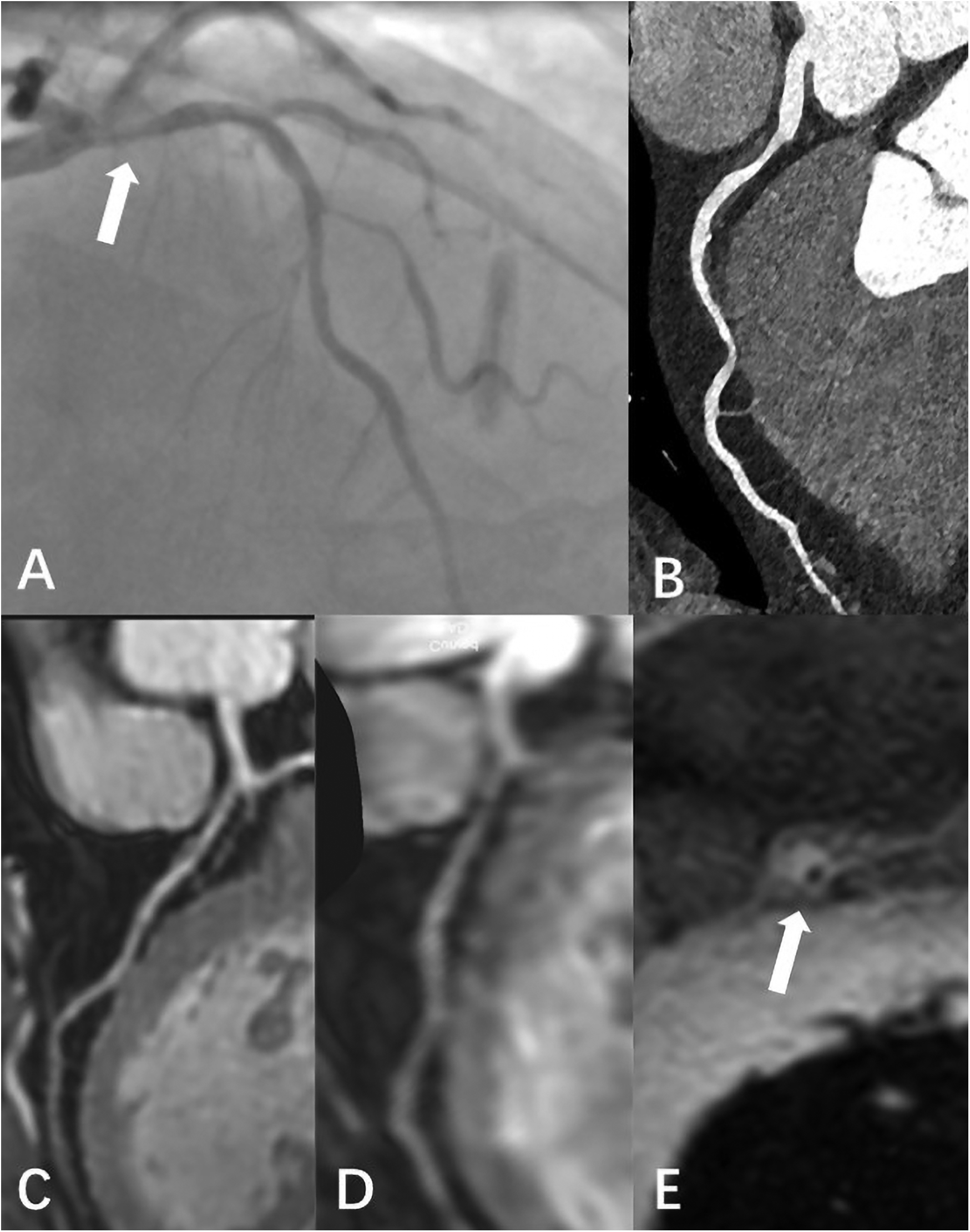 Figure 6. Male, 59 Y, with chest pain. (A) Catheter-based x-ray coronary angiography indicated a 70% stenosis at the origin of the LAD. (B) CTA revealed non-calcified plaque surrounding the lumen at the proximal LAD, with moderate stenosis. (C) 3D BTFE showed a localized signal reduction in the proximal vessel wall. (D) MSG-EPI indicated moderate stenosis in the proximal lumen. (E) Axial T1-weighted fat-suppressed black-blood sequence suggested the presence of a high-signal plaque surrounding the vessel wall.