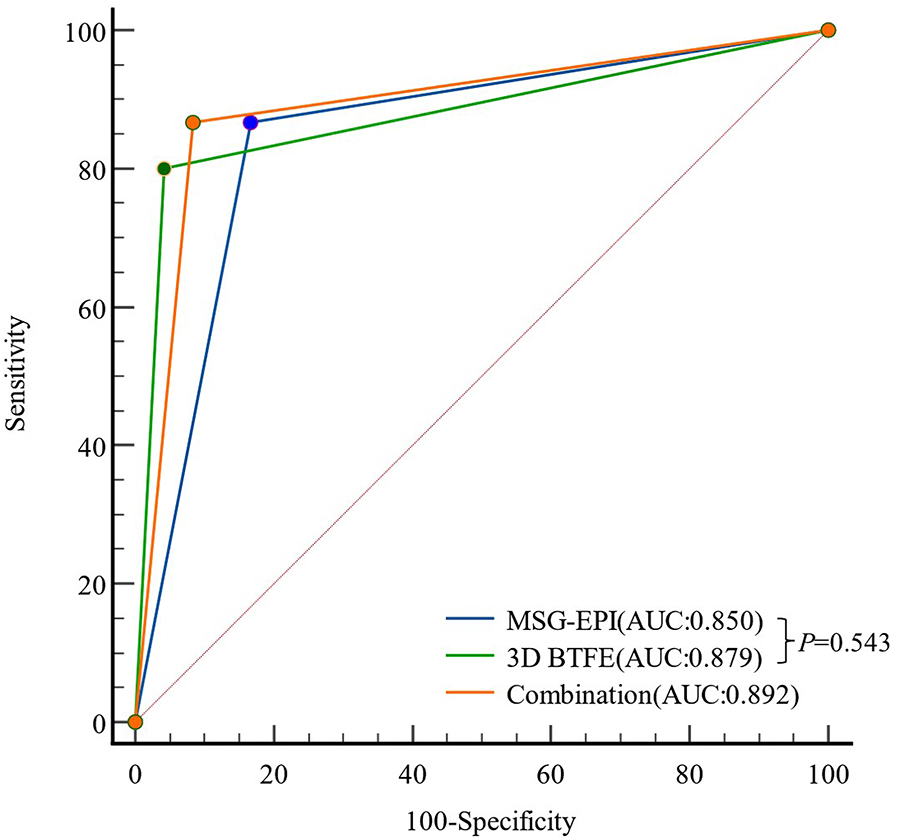 Figure 7. Receiver operating characteristic curves of MSG-EPI and 3D BTFE for the diagnosis of CADs.