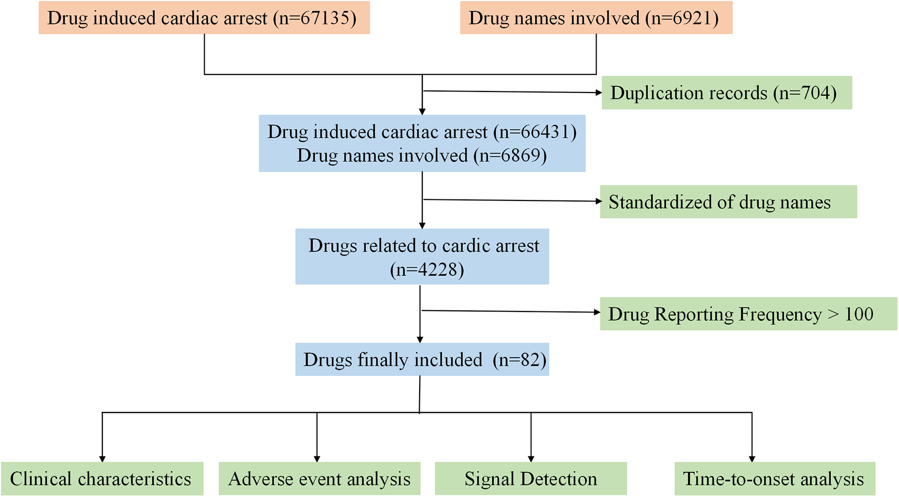 Using the Medical Dictionary for Regulatory Activities (MedDRA) (https://www.meddra.org/), “cardiac arrest” was identified as the preferred term. AEs related to CA were extracted from the FAERS database based on this term. Duplicate reports, defined as entries with identical “PRIMARYID,” reporting dates, drug names, and clinical outcomes, were removed. Drugs associated with CA were categorized into primary suspect (PS), secondary suspect (SS), concomitant, and interaction categories. Only AEs attributed to PS drugs were included in the study. PS drugs with a reporting frequency of over 100 times were selected for further analysis. In addition, when analyzing the occurrence time of adverse reactions, reports without either a “drug start date” or a “drug end date” were excluded, as well as reports with drug start dates later than the reporting time of AEs.