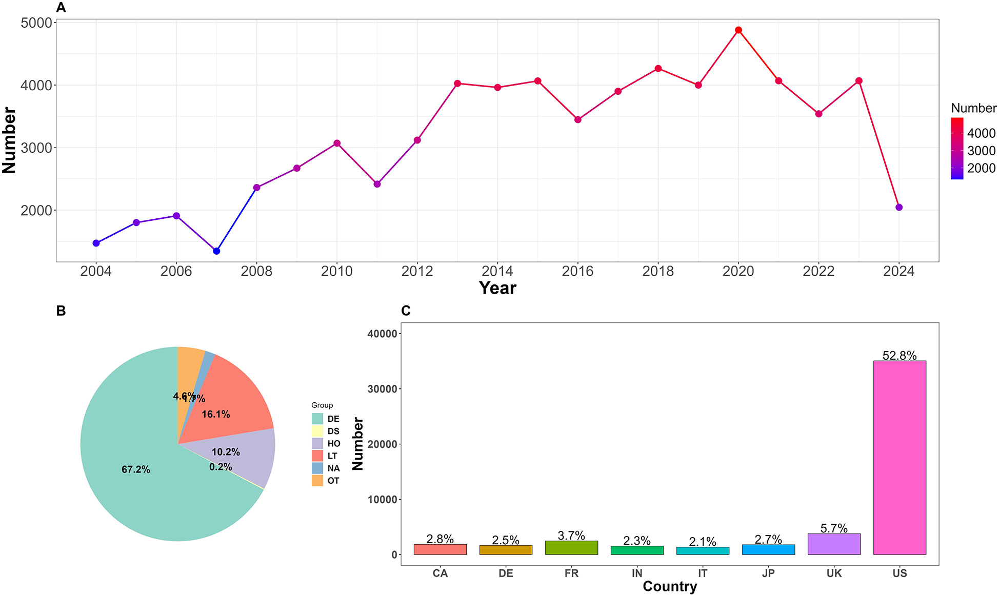 (A) Annual number of reported adverse events related to cardiac arrest. (B) Proportion of clinical outcomes. DE, death; DS, disability; HO, hospitalization; LT, life-threatening; OT, other; NA, not available. (C) Top 8 reporting countries. US, The United States; UK, The United Kingdom; JP, Japan; IT, Italy; FR, France; DE, Germany; CA, Canada.