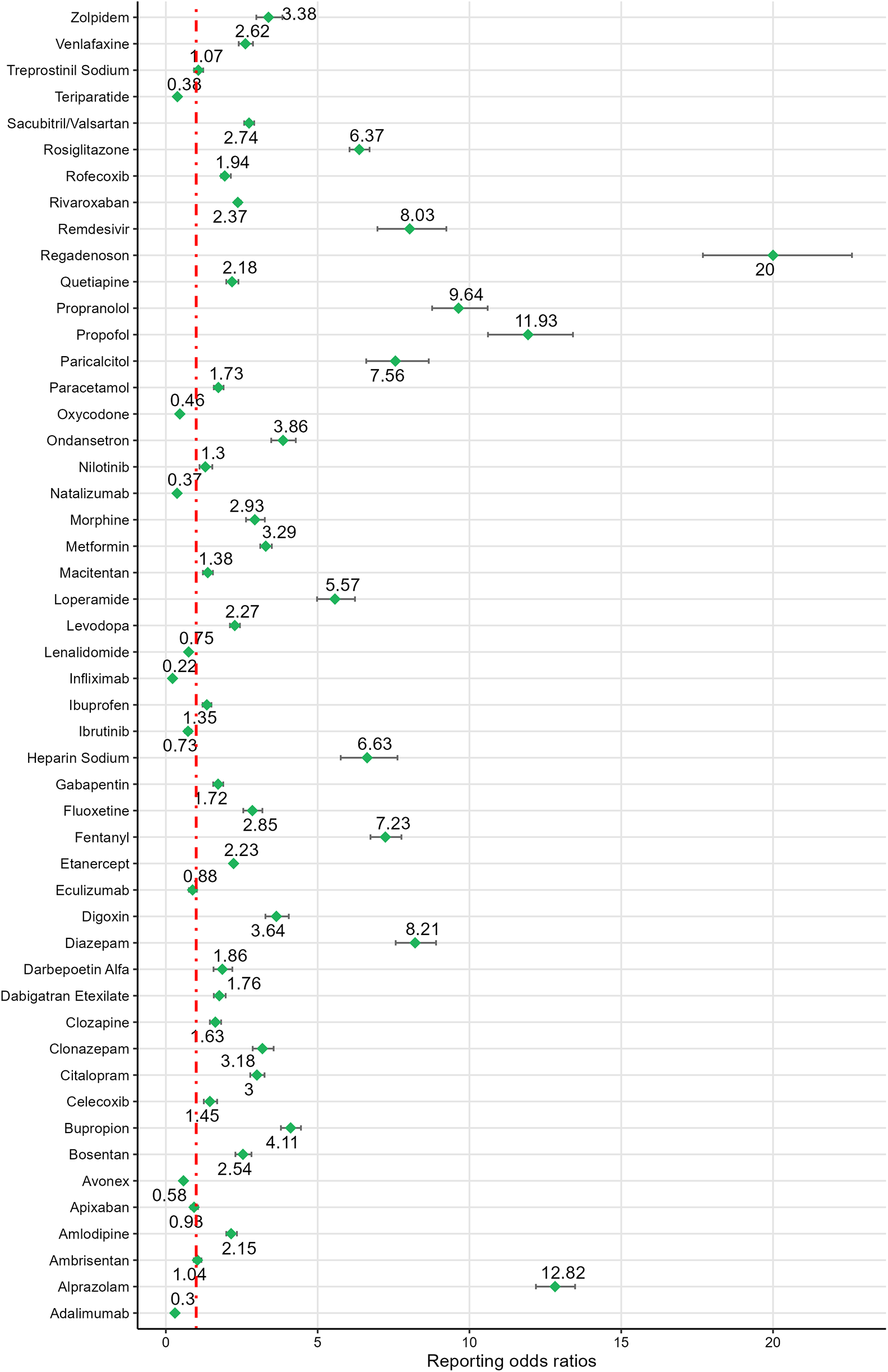 The ROR values for the negative signal drugs were less than 1(Figures 3, 4). The negative signal drugs with ROR values greater than 1 but not meeting the criteria for PRR signal detection include: rofecoxib [PRR(χ²): 1.97 (294.97)], dabigatran etexilate [PRR(χ²): 1.76 (109.13)], macitentan [PRR(χ²): 1.38 (28.87)], clozapine [PRR(χ²): 1.63 (71.18)], paracetamol [PRR(χ²): 1.73 (134.23)], ambrisentan [PRR(χ²): 1.04 (0.32)], gabapentin [PRR(χ²): 1.71 (122.15)], treprostinil sodium [PRR(χ²): 1.07 (0.84)], ibuprofen [PRR(χ²): 1.35 (30.96)], celecoxib [PRR(χ²): 1.45 (23.01)], darbepoetin alfa [PRR(χ²): 1.85 (55.38)], olanzapine [PRR(χ²): 1.23 (6.7)], quetiapine [PRR(χ²): 1.57 (119.01)], valsartan [PRR(χ²): 1.9 (84.31)], capecitabine [PRR(χ²): 1.26 (12.31)], zoledronic acid [PRR(χ²): 1.39 (11.27)], carboplatin [PRR(χ²): 1.24 (10.86)], nilotinib [PRR(χ²): 1.3 (10.12)], and oxaliplatin [PRR(χ²): 1.9 (108.89)]. These drugs exhibited no significant signals indicating an increased risk of CA.