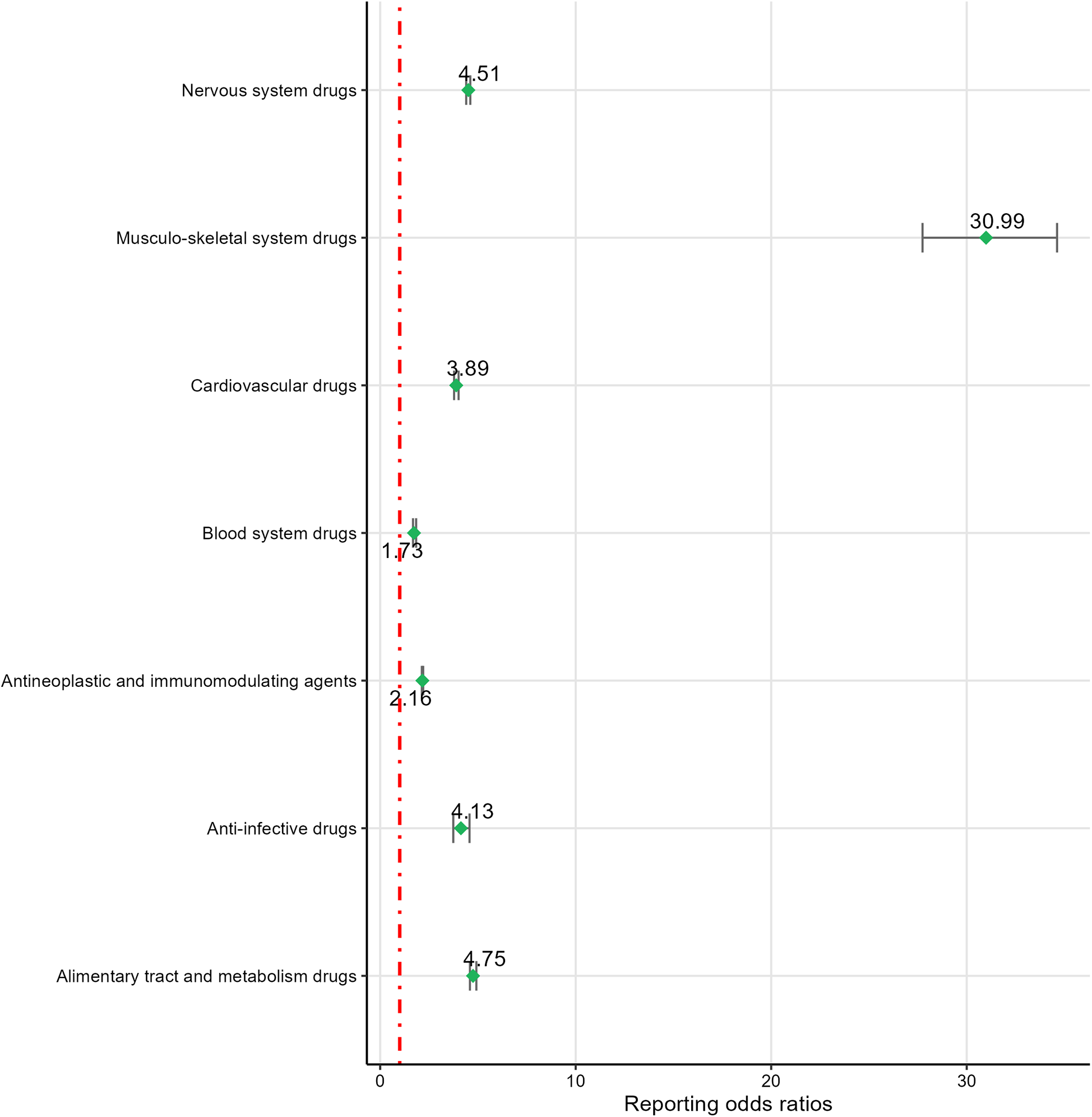 A total of 4,228 primary suspect (PS) drugs were identified as potentially inducing CA. To ensure robust signal detection, this study focused on 82 drugs with report frequencies exceeding 100. Signal detection using ROR and PRR methods identified 43 drugs with positive signals. These drugs were broadly classified into several categories based on the Anatomical Therapeutic Chemical (ATC) classification system, including alimentary tract and metabolism drugs, blood system drugs, cardiovascular drugs, nervous system drugs, antineoplastic and immunomodulating agents, anti-infective drugs, and musculo-skeletal system drugs. The strength of the risk signals for each drug category was reassessed. All drug signal detection and classifications are provided in Supplementary Table S2.