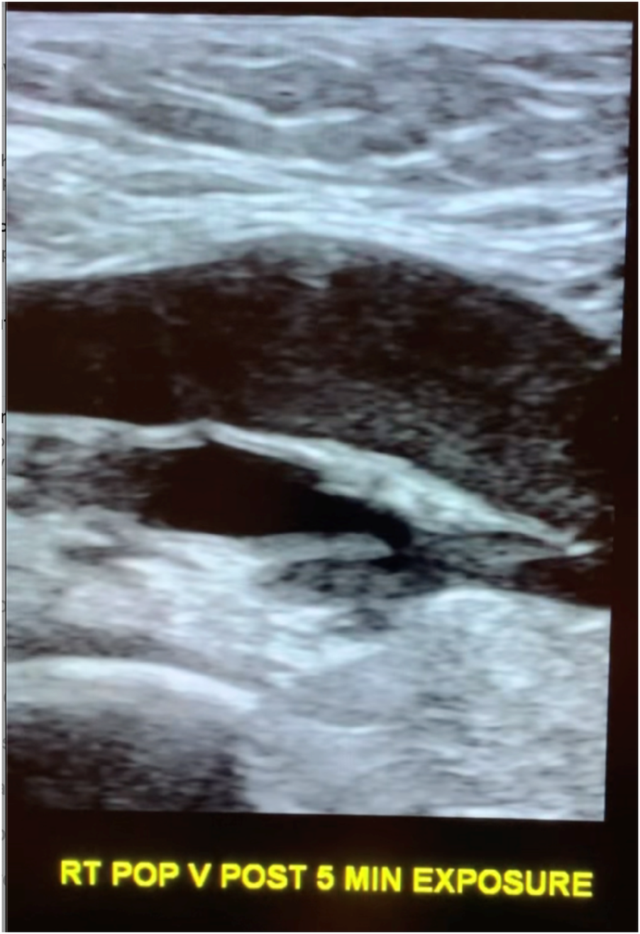 The subject returned 6 weeks later for a third and final assessment. During this imaging session, grey scale and duplex doppler pre-exposure images of the right and left popliteal vein were taken with the subject supine and also while standing. The pre-exposure images demonstrated a normal anechoic lumen to the popliteal veins in both lower extremities. An Apple iPhone 16 plus was then placed against the right popliteal fossa for 5 min. Following, images of the right and left popliteal veins were then obtained with the subject supine and standing. Post exposure images demonstrate rouleaux formation in both lower extremities.