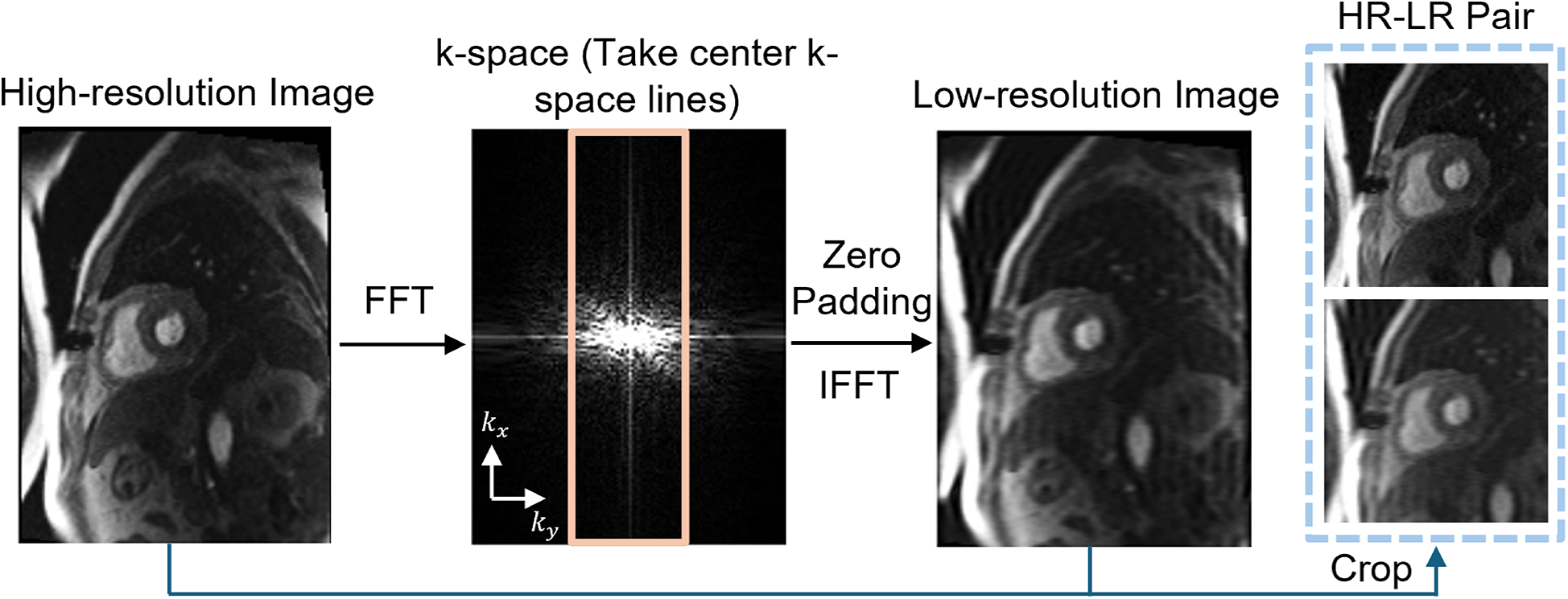 Illustration of the framework of synthetic data pipeline. High-resolution (HR) myocardial perfusion images are processed to generate synthetic low-resolution (LR) images. This involves Fast Fourier transform (FFT) of the perfusion image, taking the center k-space lines, applying zero-padding, and performing an inverse FFT (IFFT), resulting in paired HR and LR images.