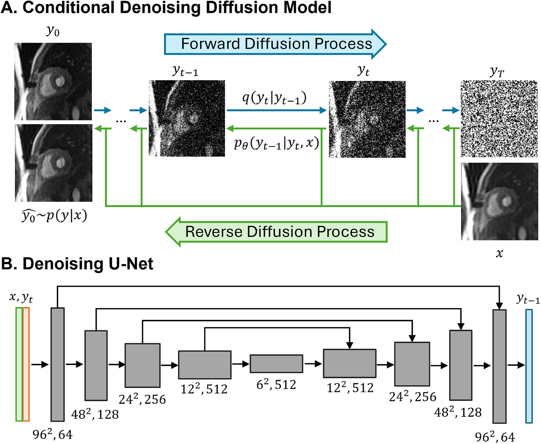 Figure 2A provides an illustration of a conditional diffusion-based model to map Gaussian noise to a HR image , conditioned on the source LR image x. The forward diffusion process q follows the Markov process to gradually add Gaussian noise to the HR perfusion image step by step until the image converges to a pure Gaussian distribution . The reverse process p utilizes a U-Net model (22), trained to conditionally denoise the image to reconstruct a HR perfusion image using the LR perfusion image x as the guidance.