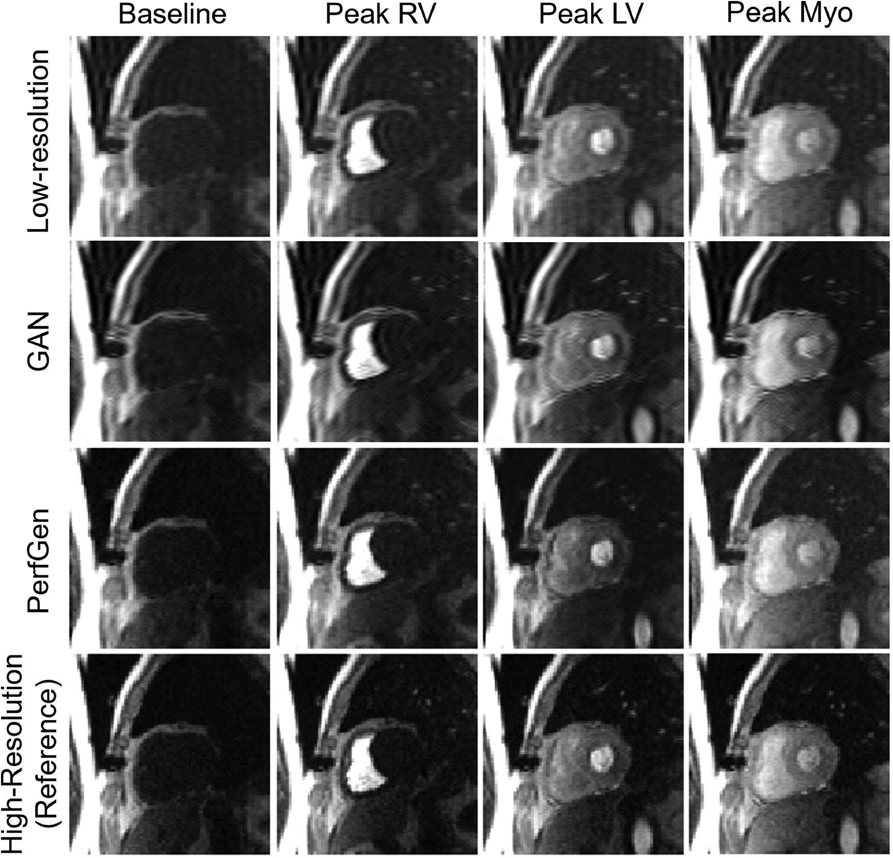 Comparison of myocardial perfusion images across perfusion phases for one retrospective test data. From left to right, the images show the perfusion image at baseline, peak right ventricle (RV), peak left ventricle (LV), and peak myocardium (Myo). Each column represents different time points, illustrating the progression of contrast perfusion through the myocardium, highlighting key cardiac phases with distinct contrast enhancement in the RV, LV, and myocardial tissue. Each row shows the low-resolution images, GAN-based super-resolved images, PerfGen super-resolved perfusion images, and high-resolution reference images.