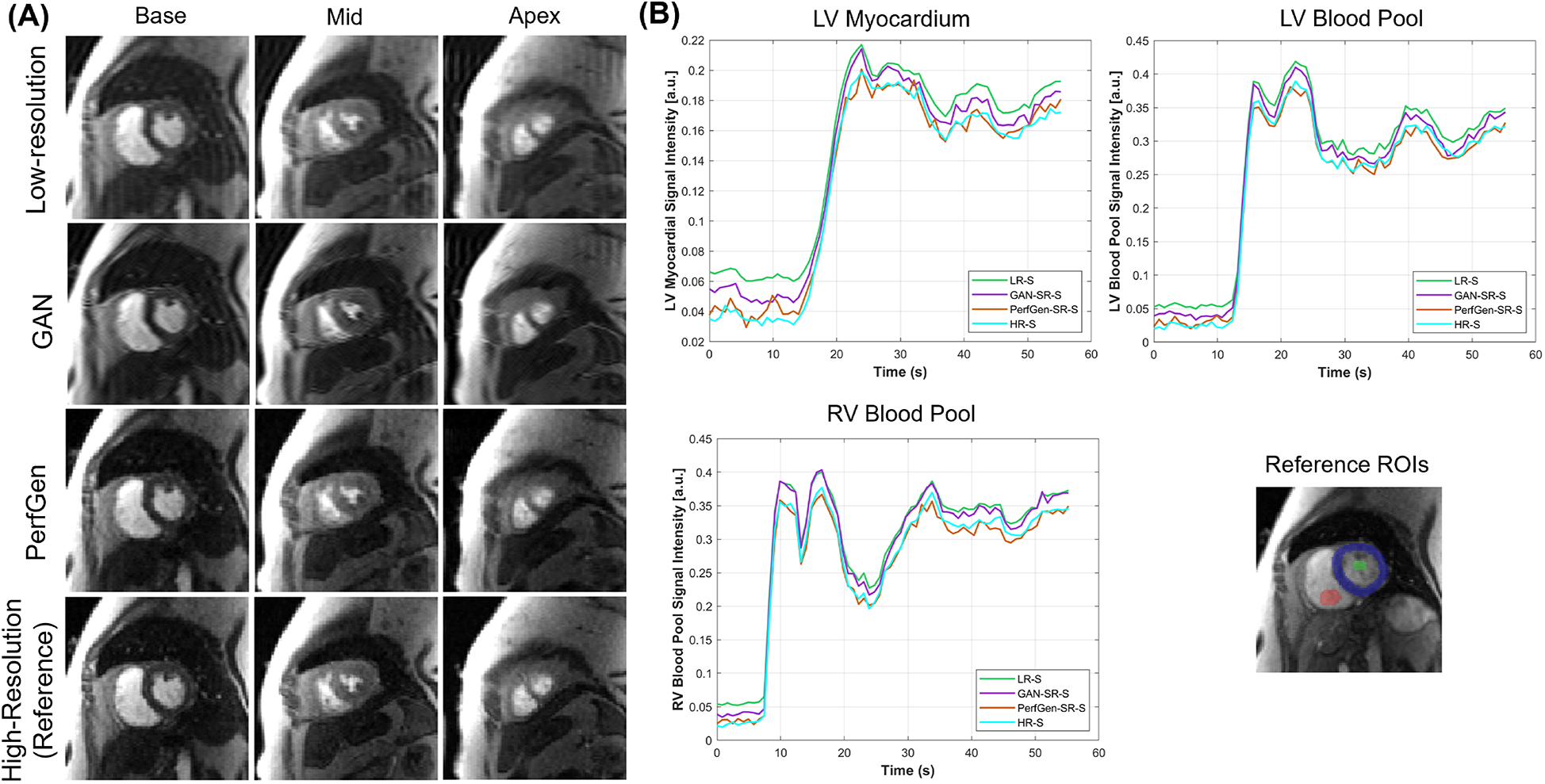 Figure 9A provides evaluation of PerfGen in enhancing myocardial perfusion images across five different perfusion slices. Super-resolved images are compared with LR images using zero-padding for five prospectively acquired slice, showing improved contrast and image detail across various perfusion phases by PerfGen. The super-resolution method demonstrates improved visualization of image details that are not as obvious in the LR images or GAN super-resolved images acquired using GRAPPA-3 and 35% phase resolution. Figure 9B shows the signal-time plots of the intensity changes over time in the LV myocardial region, LV blood pool and RV blood pool. The plots demonstrate that achieving a 4.3-fold increase in temporal resolution and five slices covered in myocardial perfusion MRI, compared to the clinically used GRAPPA-2 and three slices, improves the ability to capture sharp transitions in contrast during myocardial perfusion as compared against a synthetic low temporal resolution curve using rate-2 acceleration. Supplementary Video 1 showed the movies of six slices from one prospective patient acquired with GRAPPA-3 and 35% phase encoding lines, comparing LR, GAN-based super-resolved and PerfGen super-resolved images.