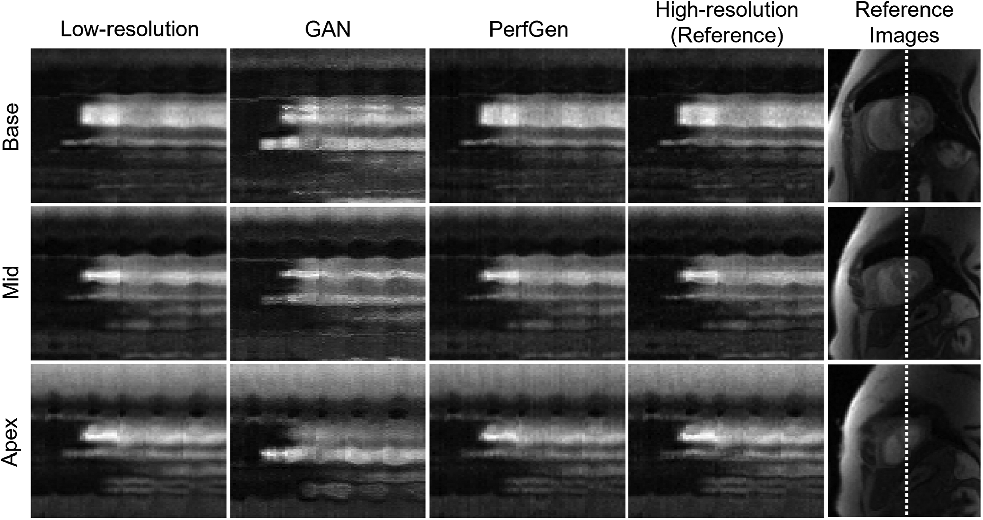 Comparison of cross-section profile along time plots corresponding to low-resolution (LR), GAN, PerfGen and reference high-resolution (HR) for the patient in Figure 4 were shown. PerfGen presents better temporal fidelity than zero-padded LR images and GAN-based super-resolved images compared to the reference HR x-t plots.