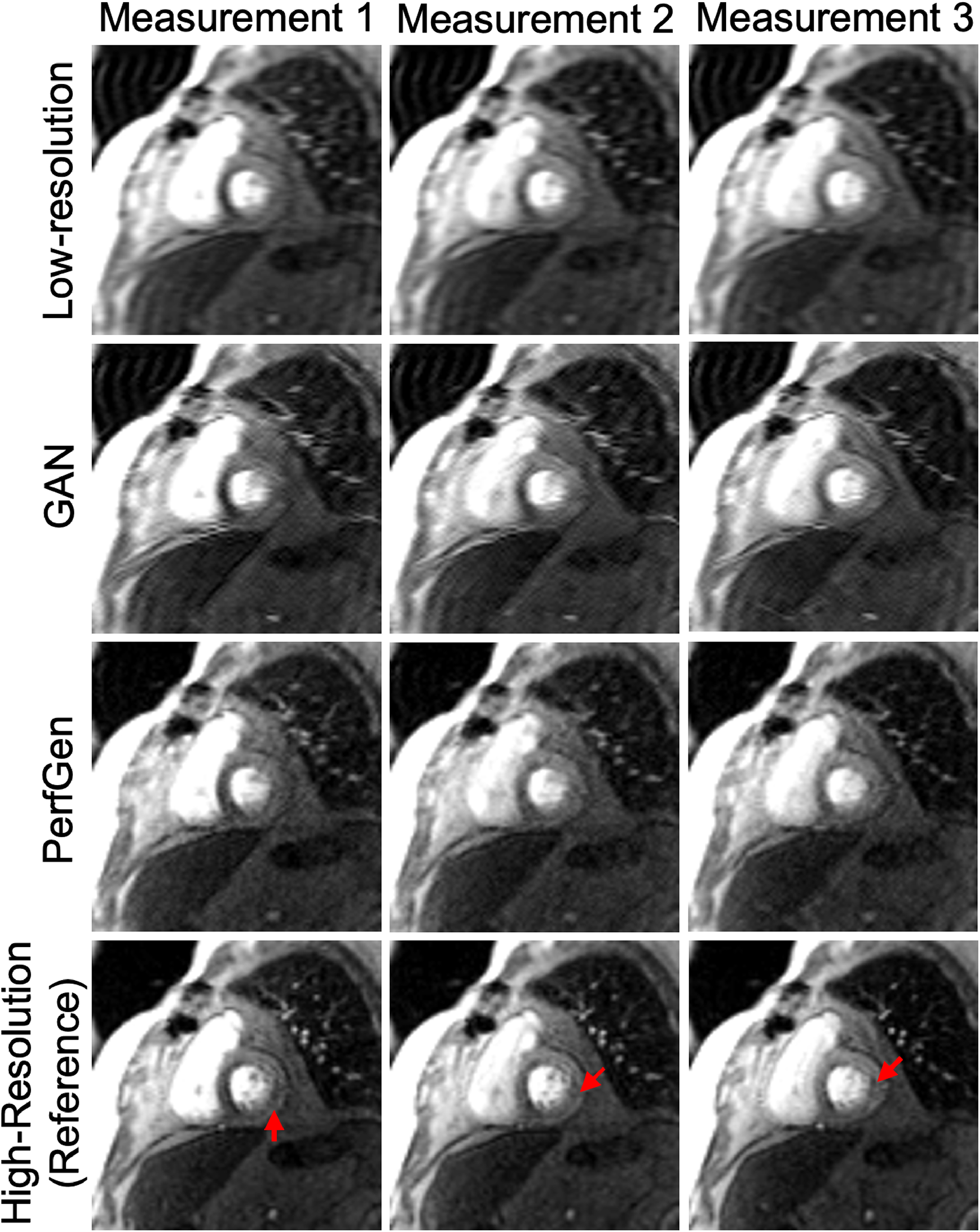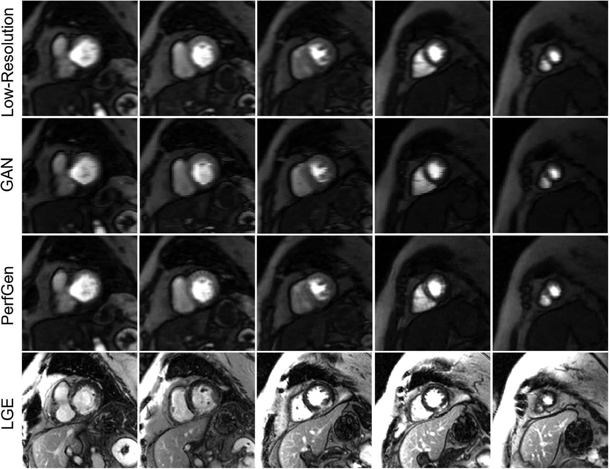 Figure 8 compares the super-resolved perfusion images by PerfGen and GAN to both LR perfusion images and LGE images. The super-resolved images show perfusion defects that closely match the defects observed in the LGE images at corresponding slice locations, providing proof-of-concept that PerfGen can potentially identify the super-resolve perfusion defects from LR images. PerfGen demonstrates better alignment with LGE compared to GAN-based super-resolved perfusion images. Furthermore, the combination of a LR acquisition with 35% phase lines and GRAPPA-2 allowed the acquisition of five slices, with a 2.86-fold improvement in temporal resolution compared to clinical routine settings, demonstrating the improved image quality with improved slice coverage.