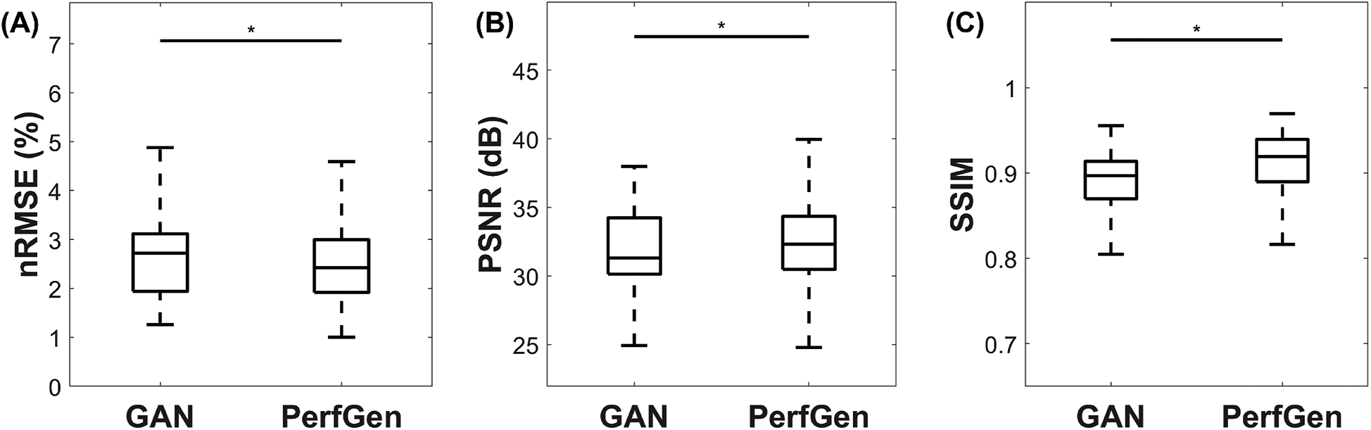 Quantitative comparison of GAN and PerfGen super-resolved myocardial perfusion images for nine tested datasets. Boxplots show (A) normalized root mean square error (nRMSE), (B) peak signal-to-noise ratio (PSNR), and (C) structural similarity index (SSIM) for GAN and PerfGen images. PerfGen demonstrates a significant improvement in all metrics, with lower nRMSE, higher PSNR, and higher SSIM compared to super-resolved images by GAN, with a reduction in nRMSE by approximately 5.1%, an increase in PSNR by 1.1%, and an improvement in SSIM by 2.2%. Statistical significance is indicated by the asterisks.