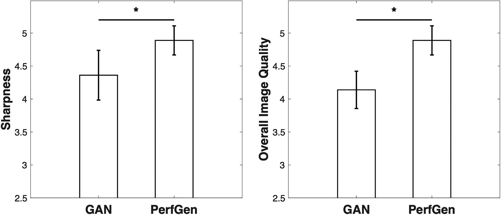 For the nine prospectively acquired subjects, all slices were evaluated by two experts in Figure 10. For sharpness, the scores were 4.36 ± 0.38 for GAN and 4.89 ± 0.22 for PerfGen (P < 0.05); for overall image quality, the scores were 4.14 ± 0.28 for GAN and 4.89 ± 0.22 for PerfGen (P < 0.05).