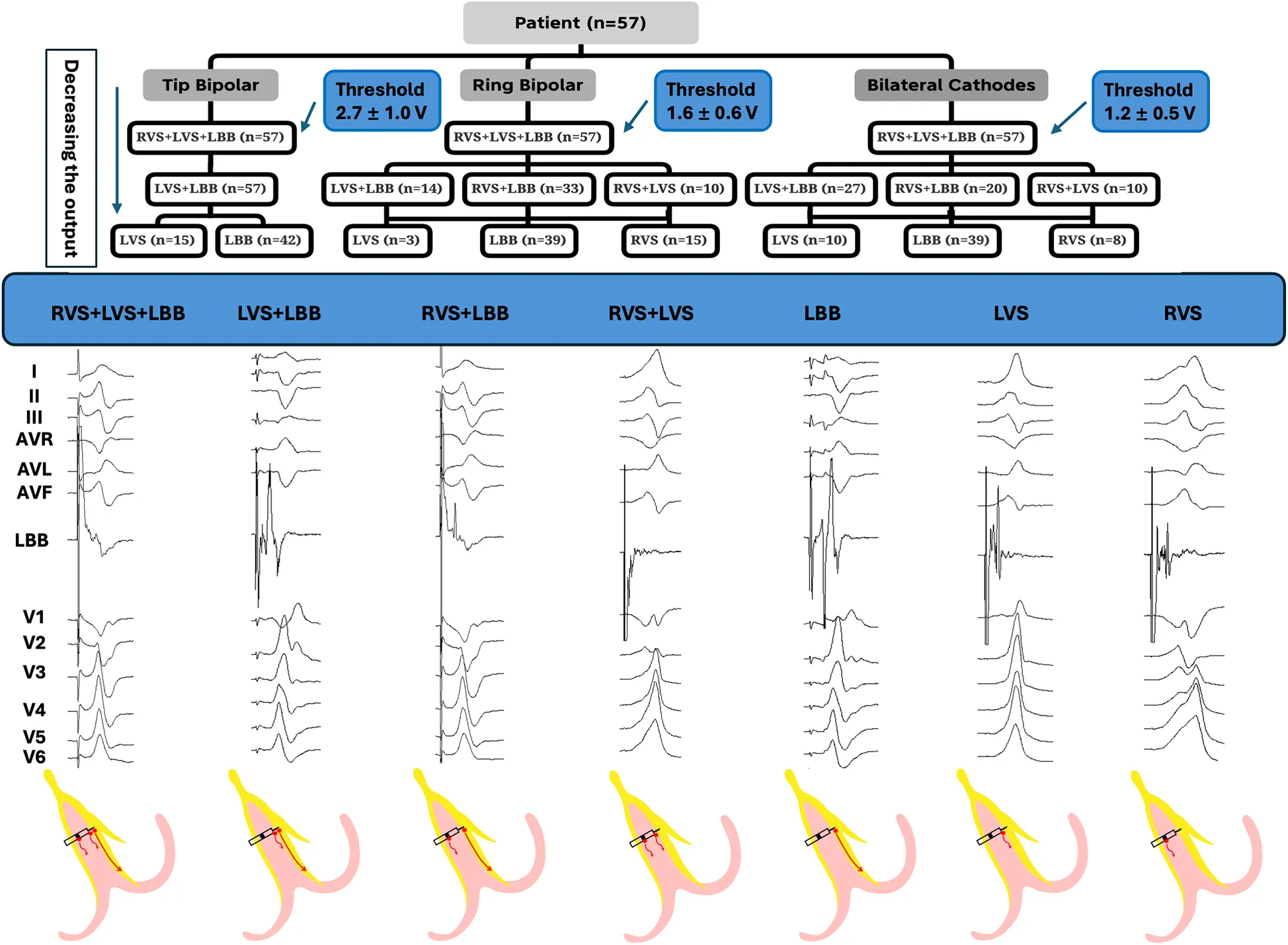 The full fusion mode (RVS + LVS + LBB) was achieved in Tip Bipolar, Ring Bipolar, and Bilateral Cathodes with a higher pacing output in all 57 patients. LBB and LVS were captured using the tip side and RVS was captured using the ring side, which presented as “QS, Qr, or QR” pattern in lead V1, a complex mixed wave in LB lead EGM, short V1\V6 RWPT, and narrow P-QRS.