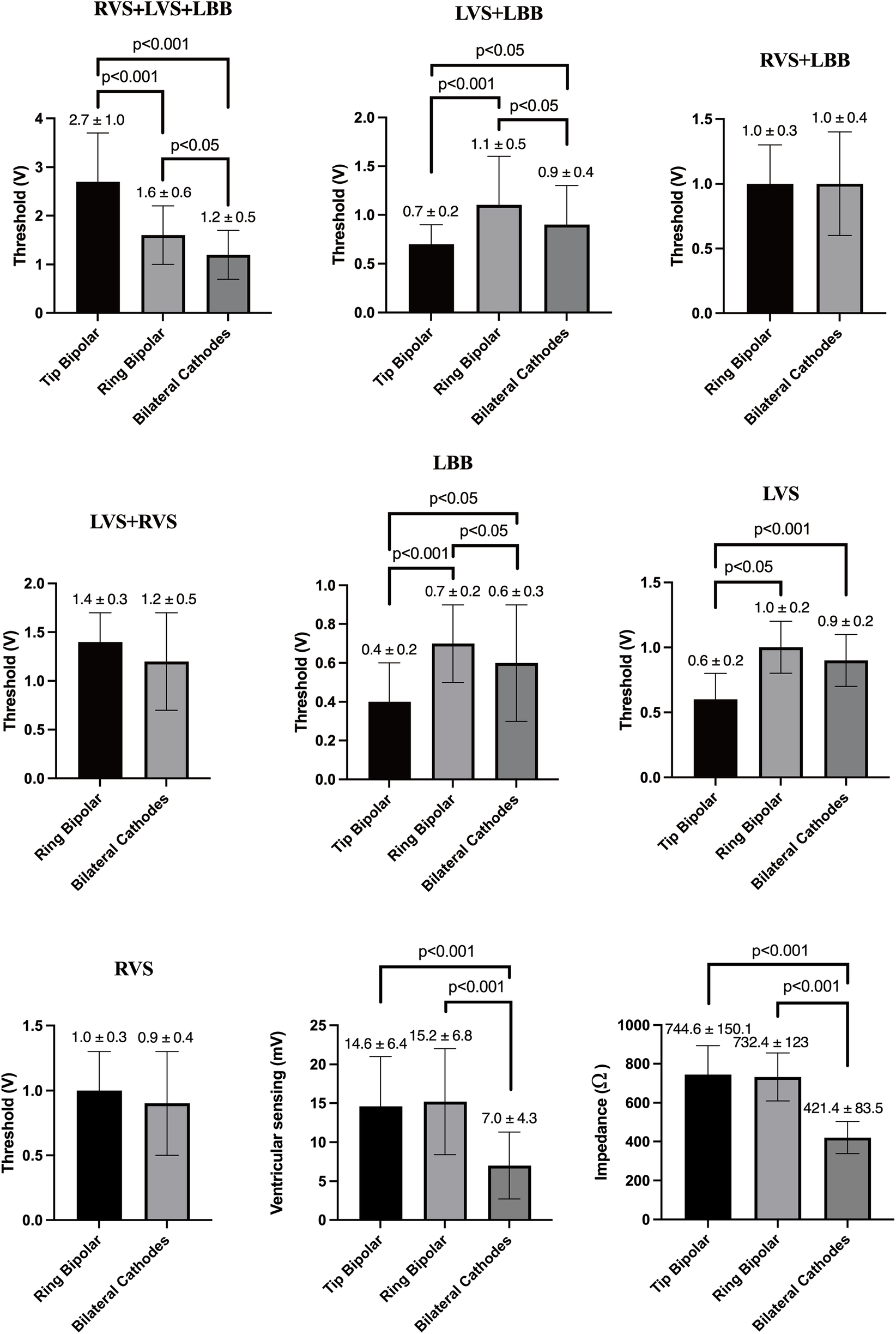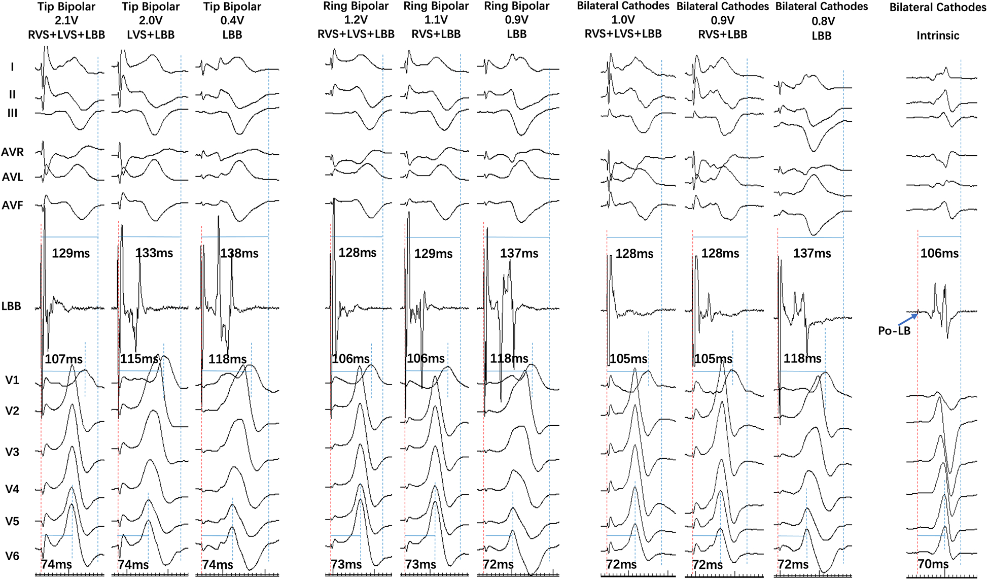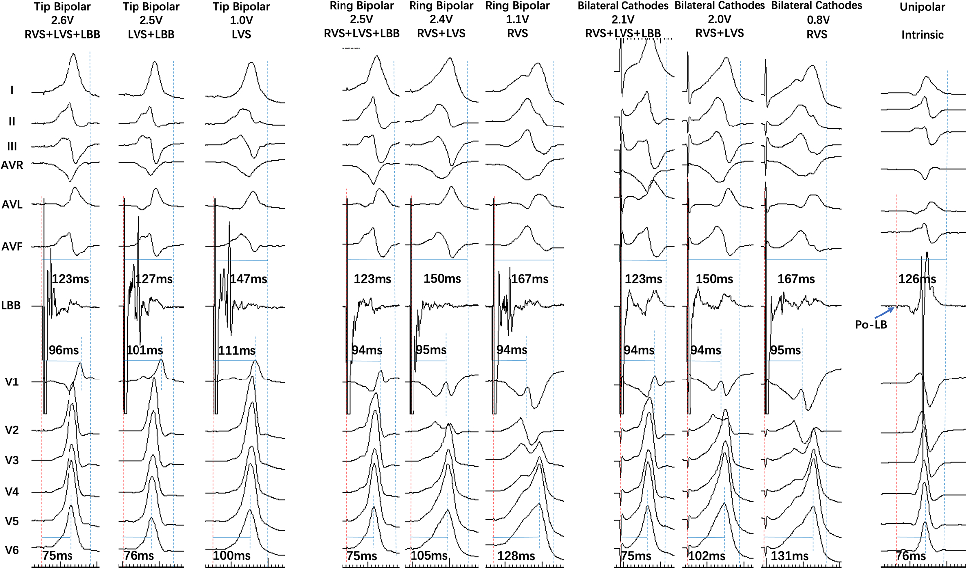 Seven capture modes [right ventricular septal (RVS) + left ventricular septal (LVS) + LBB, RVS + LBB, LVS + LBB, RVS + LVS, RVS, LVS, and LBB] were utilized in the study. The thresholds of full fusion mode (RVS + LVS + LB) in Bilateral Cathodes and Ring Bipolar were all lower than that in Tip Bipolar (1.2 ± 0.5 V vs. 2.7 ± 1.0 V, P < 0.001; 1.6 ± 0.6 V vs. 2.7 ± 1.0 V, P < 0.001). Full fusion mode had the shortest P-QRS (116.9 ± 12.8 ms) and V1 RWPT (94.5 ± 12.3 ms), V6 RWPT remain the shortest (64.9 ± 9.7 ms).