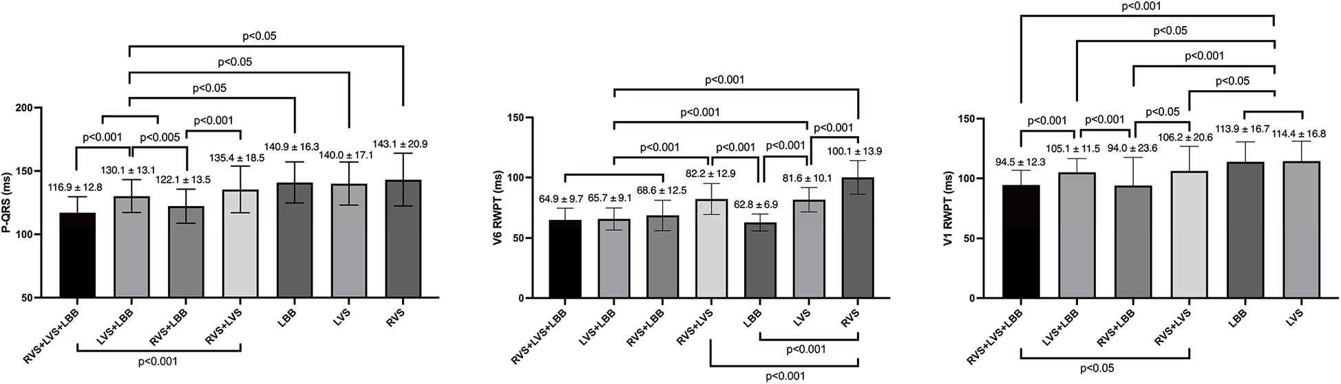 Full fusion mode and RVS + LBB capture mode all showed the shortest V1 RWPT (94.5 ± 12.3 ms vs. 94.0 ± 23.6 ms; Figure 5). LVS capture and select LBB capture mode had the longest V1 RWPT (114.4 ± 16.8 ms vs. 113.9 ± 16.7 ms).