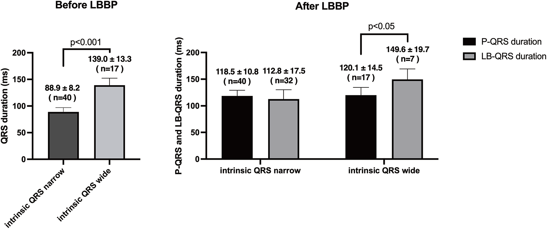 Full fusion mode was compared in subgroups of patients with a native narrow and wide QRS. A total of 40 patients had a native narrow QRS, and 17 patients had a native wide QRS (Figure 6). The P-QRS duration of full fusion mode was almost as short as the LB-QRS duration in intrinsic rhythm in patients with native narrow QRS (118.5 ± 10.8 ms vs. 112.8 ± 17.5 ms, P = 0.1). In patients with native wide QRS, the P-QRS duration of full fusion mode showed a statistically significant difference to the LB-QRS duration in intrinsic rhythm (120.1 ± 14.5 ms vs. 149.6 ± 19.7 ms, P < 0.05).