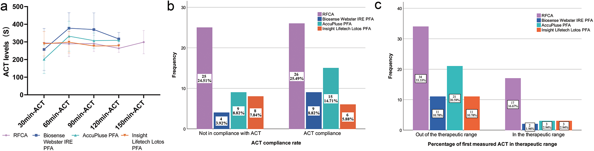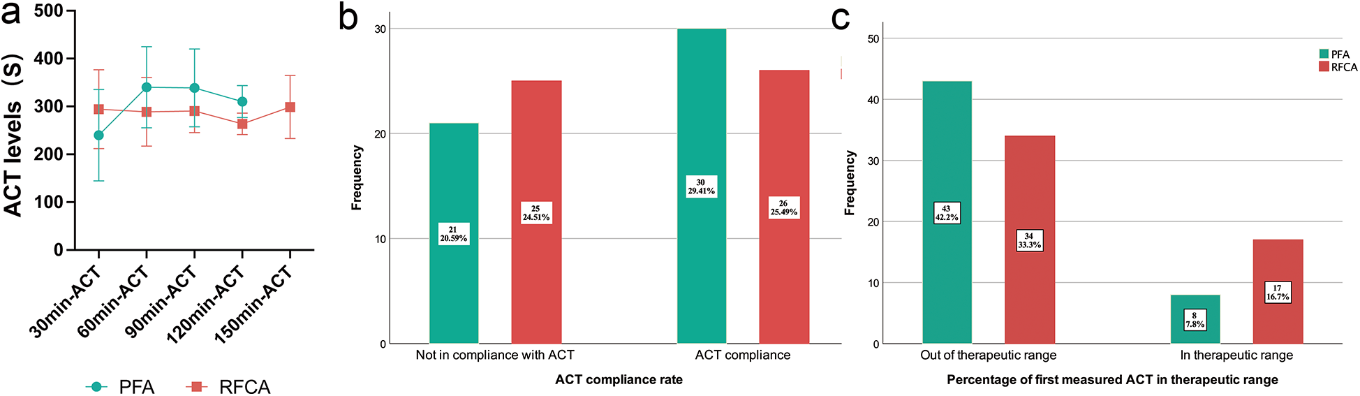Intraprocedural ACTs of the PFA group and RFCA group. (a) shows the intraprocedural ACTs at each 30-minute interval, (b) shows the ACT compliance rate of the PFA group and the RFCA group and (c) shows the percentage of first measured ACT in the therapeutic range of the PFA group and the RFCA group. The percentages in the bar chart represent the proportion of all patients.
