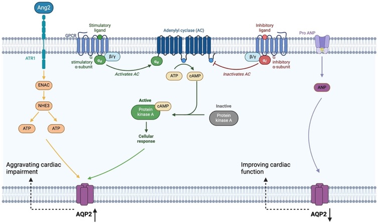 Figure 1. Mechanisms by which traditional Chinese medicine regulates AQP2 in water metabolism disorders. AQP2-mediated regulation of renal water balance is intimately linked to the development and progression of heart failure. Angiotensin II (Ang II) engages AT1 receptors to trigger the ENaC/NHE3 pathway, leading to VP release and increased aldosterone production. These hormonal signals synergistically elevate AQP2 expression in renal collecting duct cells, resulting in fluid retention and hyponatremia that worsen heart failure symptoms. In contrast, the serine protease Corin converts pro-ANP into its active form, ANP, which suppresses AQP2 expression, and ultimately improving the clinical manifestations of heart failure.
