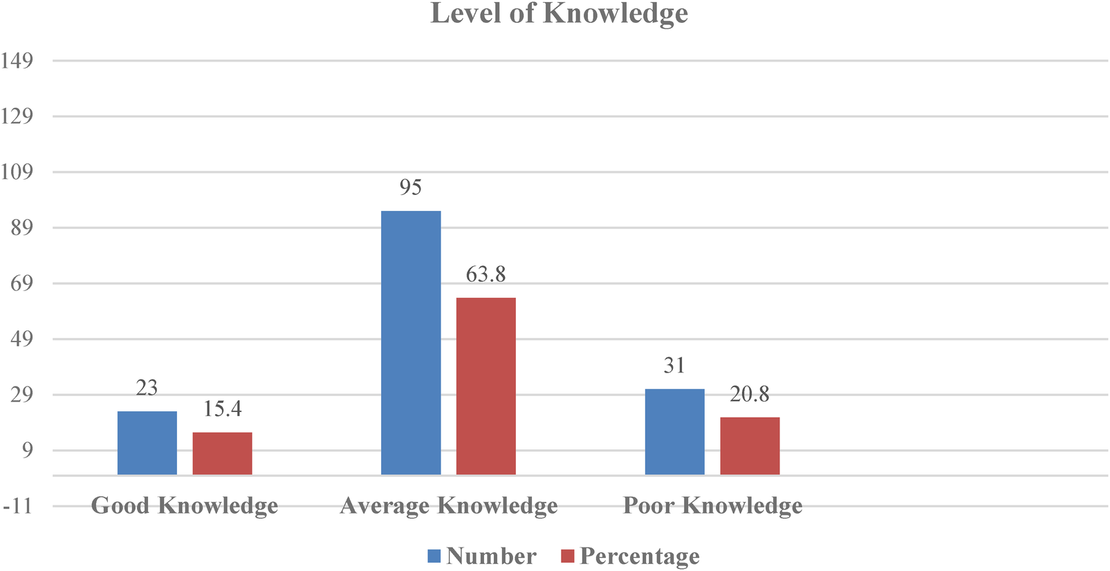 The frequency distribution of the knowledge level of nurses regarding telenursing is depicted in Figure 1. Among the 149 nurses surveyed, 23 (15.4%) demonstrated good knowledge, 95 (63.8%) had average knowledge, and 31 (20.8%) had poor knowledge. The mean scores for knowledge about telenursing across various subsections are presented in Table 2. The total mean knowledge score was 14.92 ± 3.2. The highest mean score was observed in the subsection on general information about telenursing (2.81 ± 0.96), while the lowest mean score was recorded in the subsection on risk management in telenursing (1.56 ± 1.16).