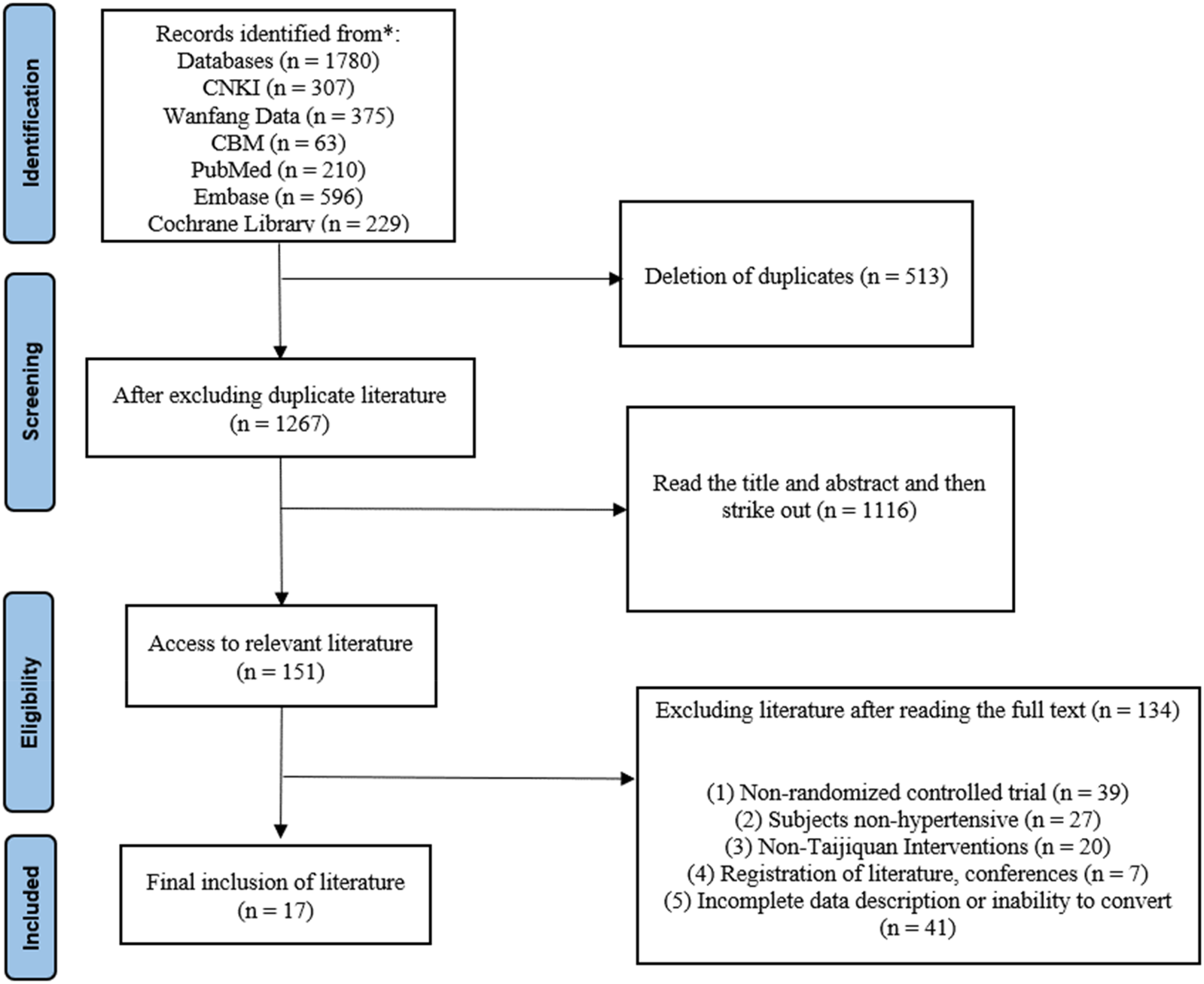We searched Chinese and English databases and retrieved a total of 1,780 documents. First, NoteExpress literature management software was used to remove duplicates, literature reviews, meta-analyses, animal studies, and conference registrations. Titles, authors, publication years, and journals were then manually screened. Machine-based screening identified and excluded 513 duplicate papers. Further review of the remaining 1,267 abstracts led to the exclusion of studies for the following reasons: (1) not being randomized controlled trials, (2) participants not having hypertension, (3) interventions not involving Tai Chi, (4) being conference abstracts or registration papers, and (5) incomplete or unconvertible data. After a full-text review of 151 studies, 17 articles were deemed eligible for inclusion (Figure 1).