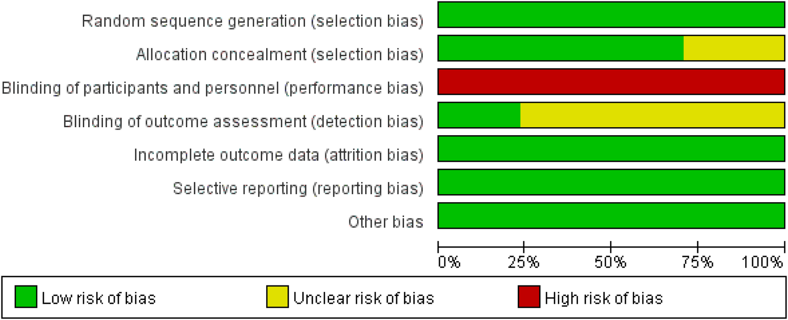 We assessed the methodological quality of the included studies using the Cochrane risk-of-bias tool (22). Two researchers independently evaluated each study, resolving any disagreements with a third reviewer. Seven domains were considered: random sequence generation (selection bias), allocation concealment (selection bias), blinding of participants and personnel (performance bias), blinding of outcome assessment (detection bias), incomplete outcome data (attrition bias), selective reporting (reporting bias), and other potential sources of bias (23). Studies were classified as low risk (five or more domains rated as low risk), moderate risk (three to four domains rated as low risk), or high risk (fewer than three domains rated as low risk) (24).