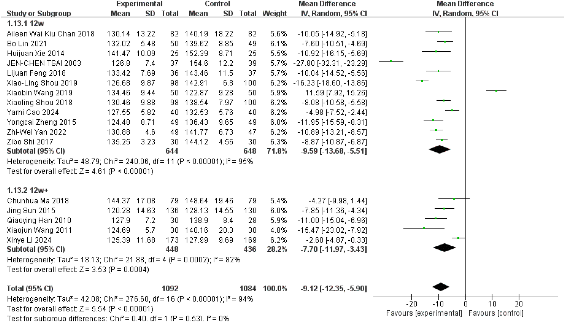 Tai Chi exercise is divided into long-term and short-term intervention cycles, defined as more than three months for long-term and less than three months for short-term interventions. To investigate potential differences in the effects of these intervention cycles on blood pressure in hypertensive patients, time was utilized as a subgroup variable. To further explore the effects of Tai Chi on SBP in hypertensive patients, studies were sub-grouped based on intervention duration: short-term (12 weeks) and long-term (more than 12 weeks). Twelve studies with a short-term intervention demonstrated a significant SBP reduction with Tai Chi (Figure 4, WMD = −9.59; 95% CI = −13.68 to −5.51; Z = 4.61, P = 0.00001 < 0.05; I2 = 95%; Egger's test P = 0.921 > 0.05) (10, 27–32, 35–37, 40, 41), Similarly, five studies with long-term intervention also showed a significant decrease in SBP (Figure 4, WMD = −7.70; 95% CI = −11.97 to −3.43; Z = 3.53, P = 0.0004 < 0.05; I2 = 82%; Egger's test, P = 0.153 > 0.05) (11, 33, 34, 38, 39).
