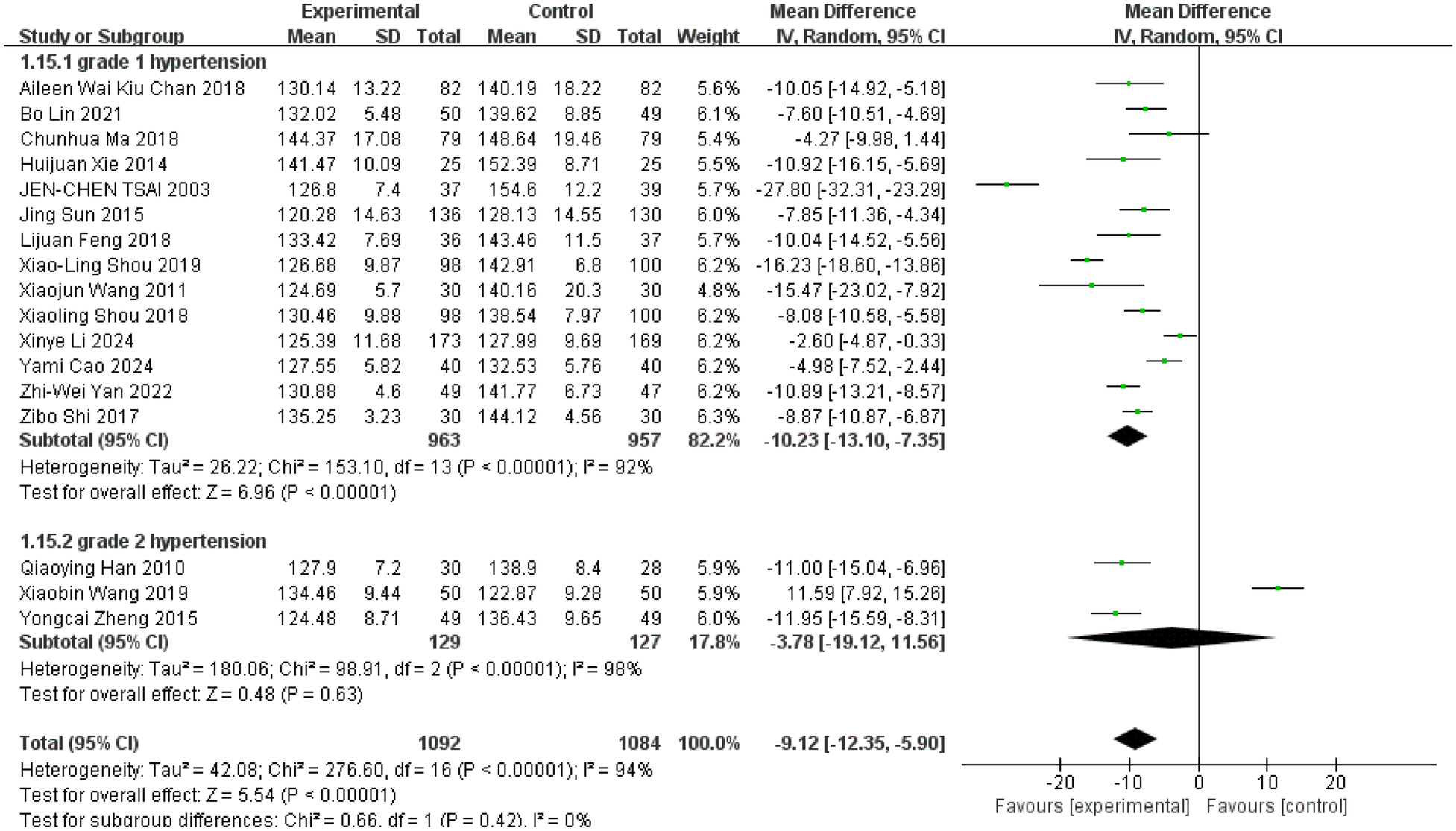 Hypertension is classified into three types: Grade I, Grade II, and Grade III. Grade I hypertension is defined as a systolic blood pressure (SBP) between 140 and 159 mmHg, or a diastolic blood pressure (DBP) between 90 and 99 mmHg. Grade II hypertension is defined as a SBP between 160 and 179 mmHg, or a DBP between 100 and 109 mmHg. Grade III hypertension is defined as a SBP of 180 mmHg or higher, or a DBP of 110 mmHg or higher (1). In studies examining the effects of Tai Chi on hypertension, these subtypes were used as grouping variables, classifying participants into Grade I and Grade II categories. Fourteen studies focused on Grade I hypertension showed that Tai Chi significantly reduced systolic blood pressure (SBP) (Figure 5, WMD = −10.23; 95% CI = −13.10 to −7.35; Z = 6.96, P = 0.00001 < 0.05; I2 = 92%; Egger's test P = 0.375 > 0.05) (10, 11, 28, 30–32, 34–41). Interestingly, three studies targeting Grade II hypertension indicated that while Tai Chi was able to reduce SBP, the difference was not statistically significant (Figure 5, WMD = −3.78; 95% CI = −19.12 to 11.56; Z = 0.48, P = 0.63 > 0.05; I2 = 98%; Egger's test P = 0.754 > 0.05) (27, 29, 33). There was no significant difference between the two groups. Through the one-by-one elimination method, it is found that Wang's (27) study in the Grade 2 hypertension group may be the source of its heterogeneity. After removing it, the analysis results of the Grade 2 hypertension group show that (WMD = −11.52; 95% CI = −14.23 to −8.82; Z = 8.35, P = 0.00001 < 0.05; I2 = 0%) (The figure is in the Supplementary Material).