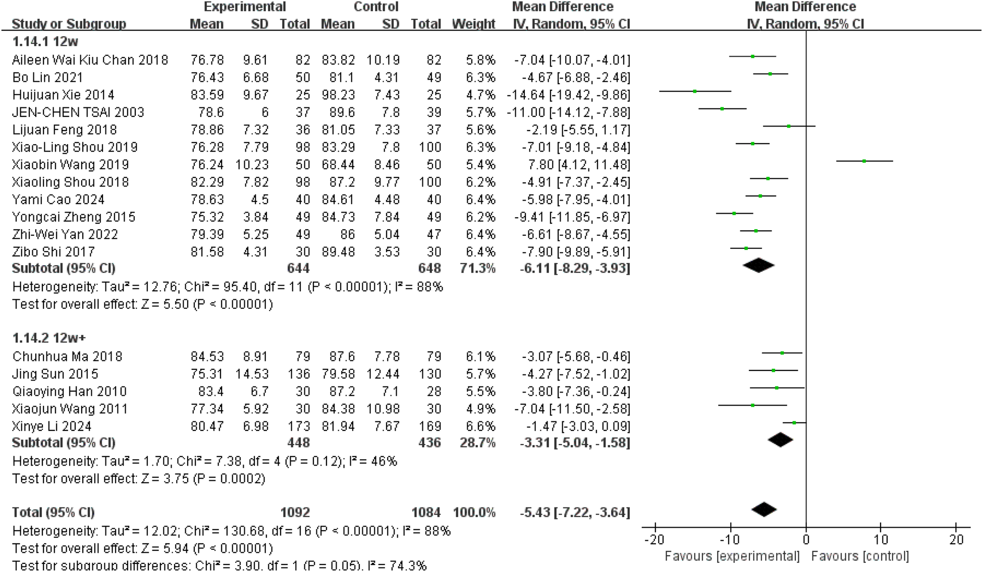 Subgroup analyses revealed a highly significant reduction in DBP among participants engaged in Tai Chi for 12 weeks compared to controls (Figure 6, WMD = −6.11; 95% CI = −8.29 to −3.93; Z = 5.50, P = 0.00001 < 0.05; I2 = 88%; Egger's test, P = 0.689 > 0.05). Additionally, Tai Chi participants demonstrated significantly lower DBP levels compared to controls over intervention durations exceeding 12 weeks (Figure 6, WMD = −3.31; 95% CI = −5.04 to −1.58; Z = 3.75, P = 0.0002 < 0.05; I2 = 46%; Egger's test, P = 0.005).